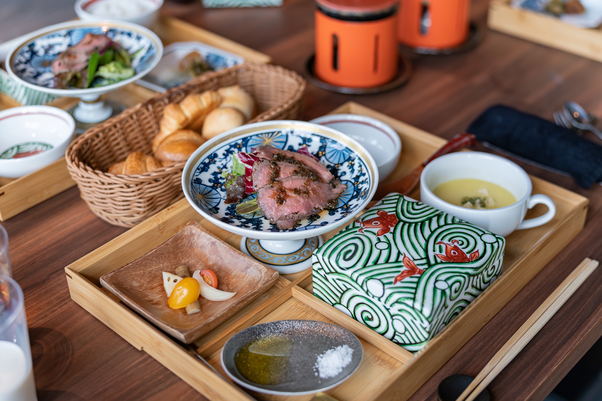 쯔케모노(절임요리), 스프, 로스트 비프, 야채 샐러드, 찜 요리, 된장국 등이 나왔으며 밥과 빵 중 하나를 고를 수 있었습니다.