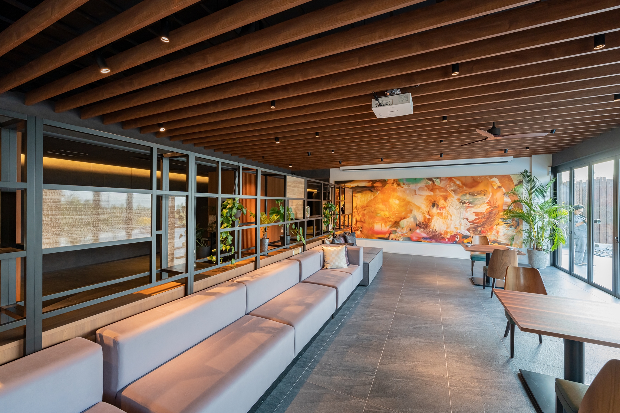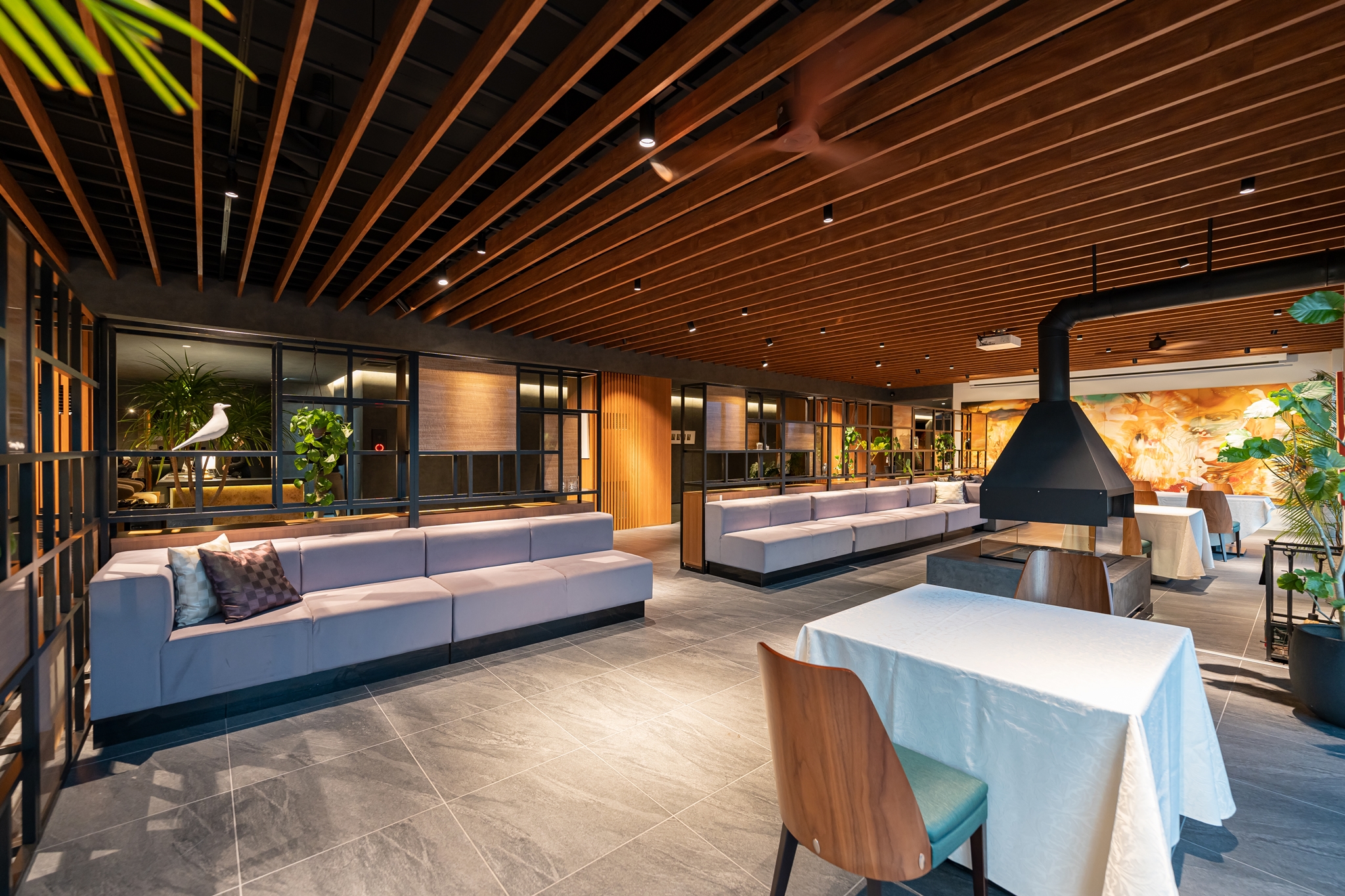 라이트 업을 하여 분위기 있게 바뀐 수영장이 보이는 자리로 자리를 잡았습니다.