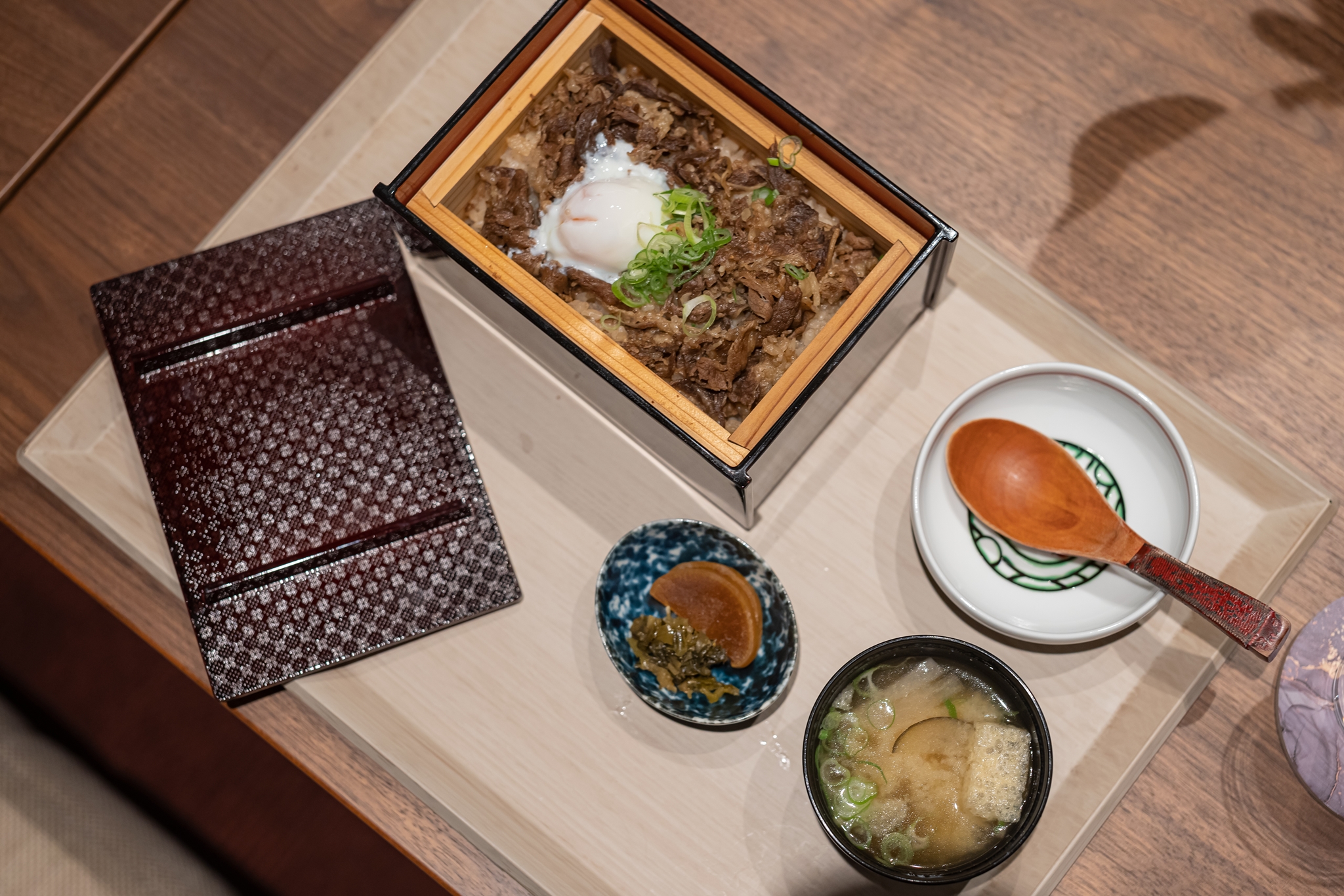 소고기를 얇게 잘라 양념을 하여 밥과 함께 쪄낸 요리로 고소하고 온천 달걀(온천수로 익힌 반숙 계란)이 올려져 있었습니다.