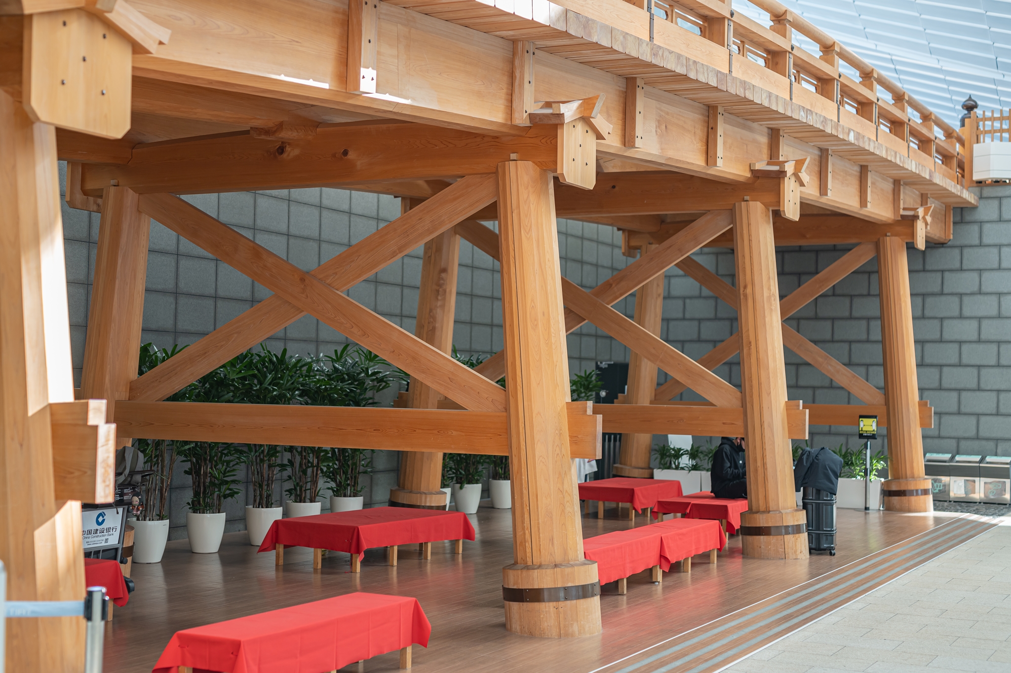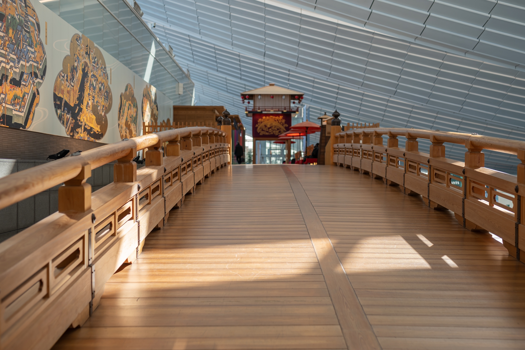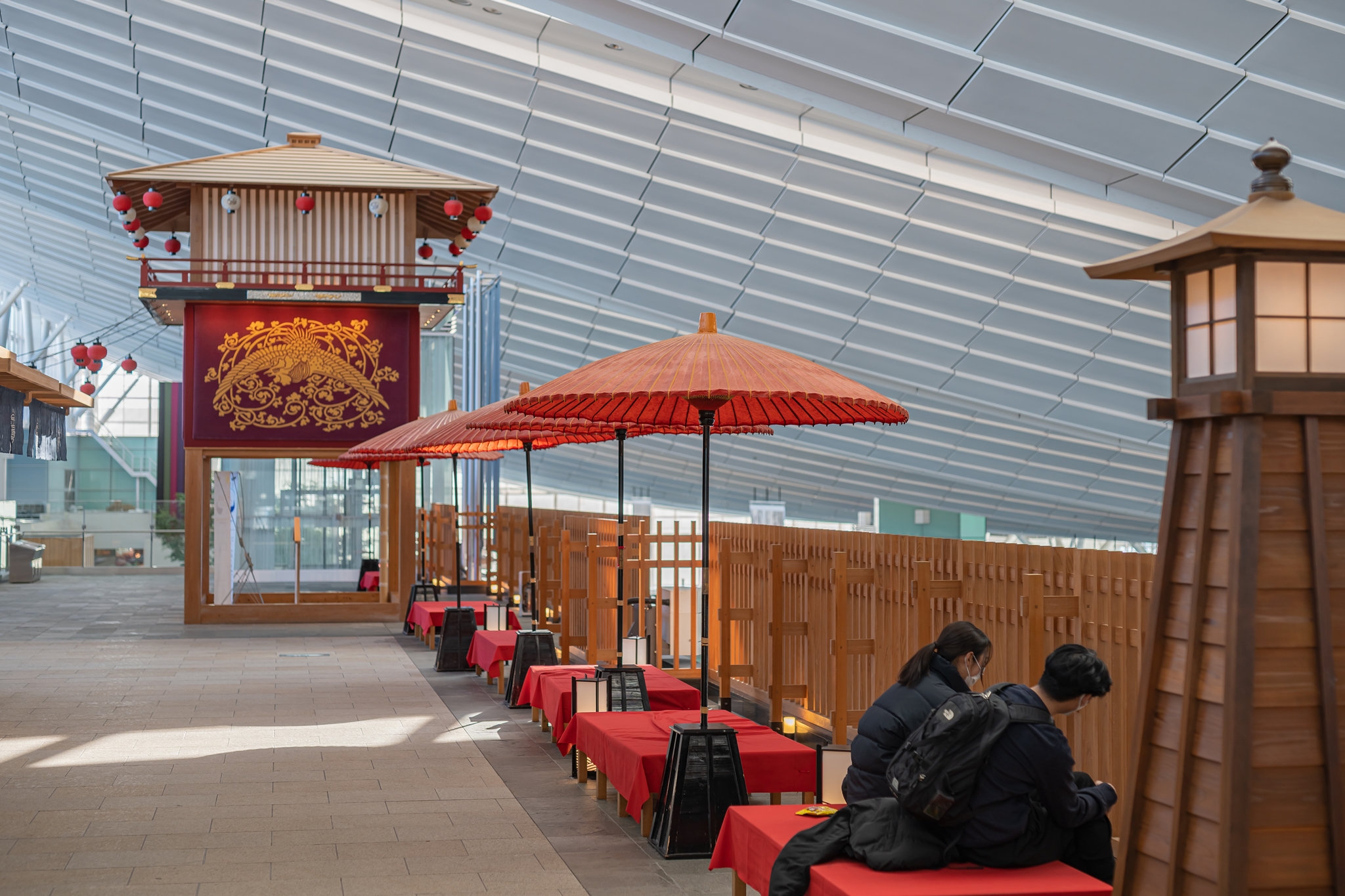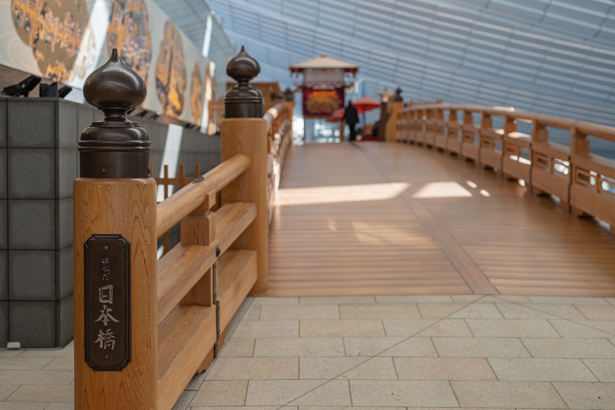 그 옆에는 옛 도쿄의 중심에 있었던 나무 다리인 니혼바시를 재현해 놓은 공간이 있으며 이 다리 밑은 이른 새벽 비행기를 타기 위해 공항에서 노숙하는 사람들이 많이 모입니다. 지금은 없지만 밤 도깨비 여행이나 다른 공항으로 늦은 연결편을 이용하는 사람들이 이곳에서 많이 누워 있었습니다.