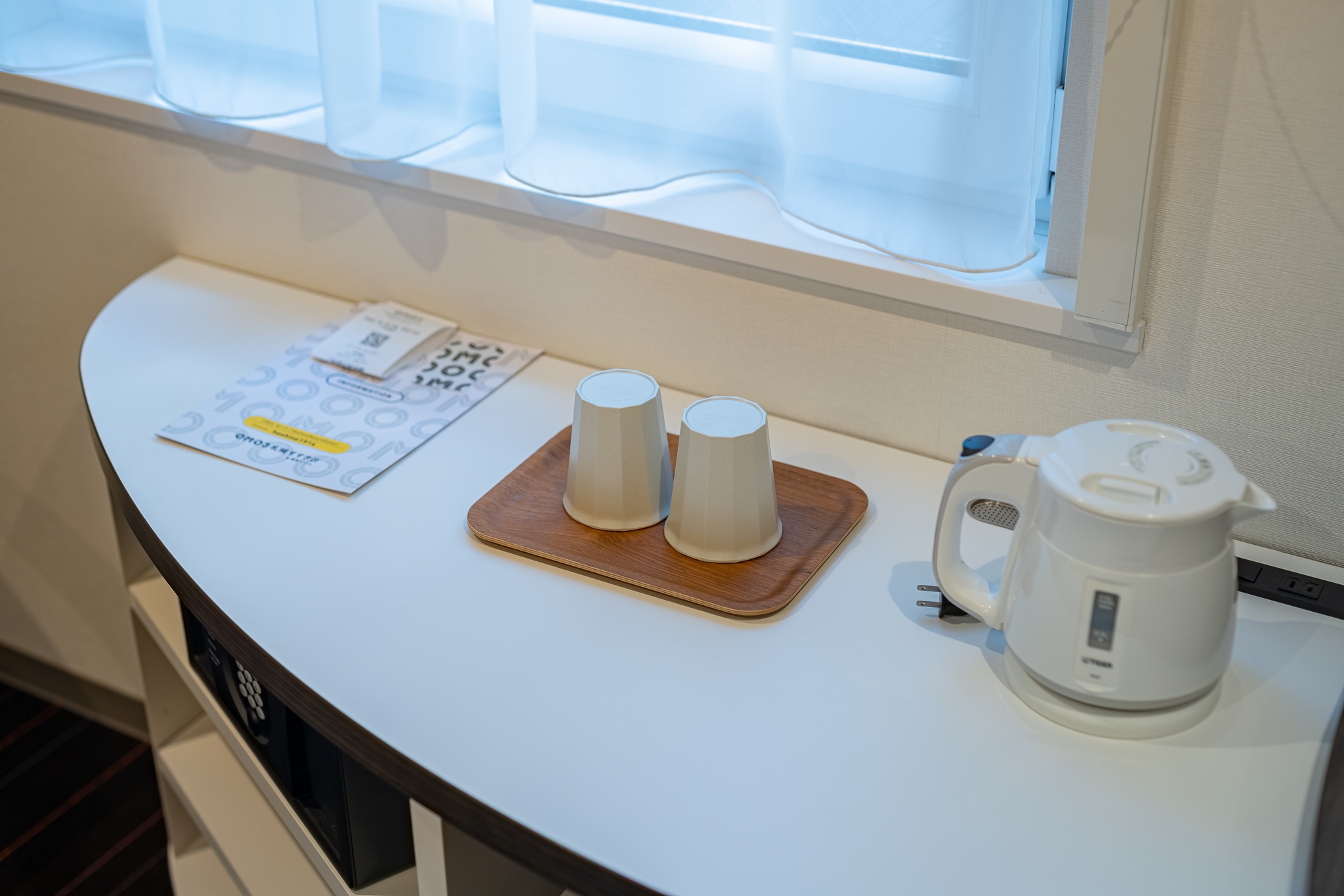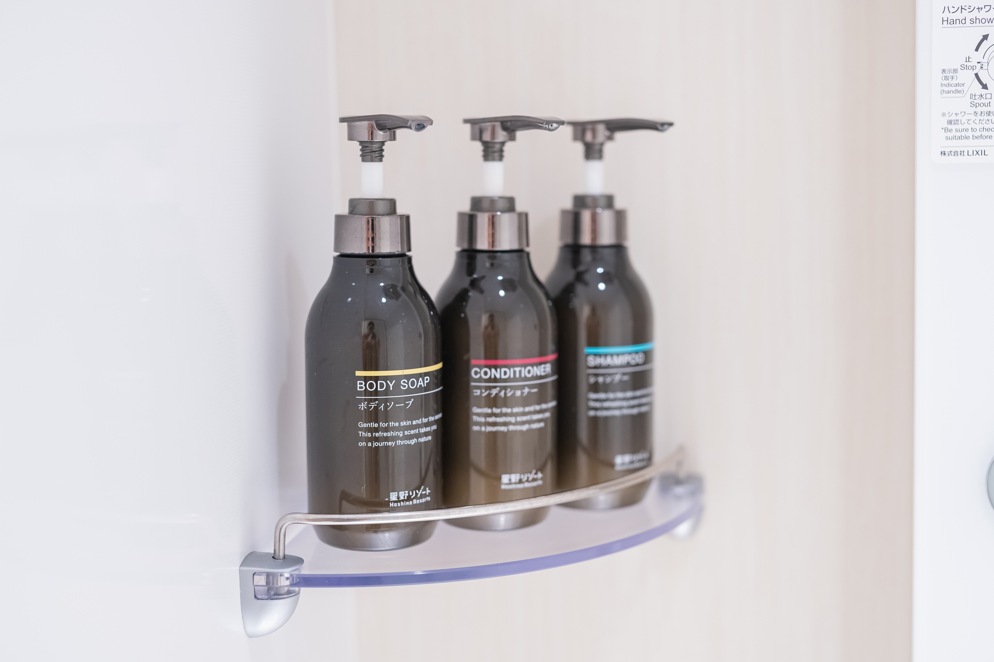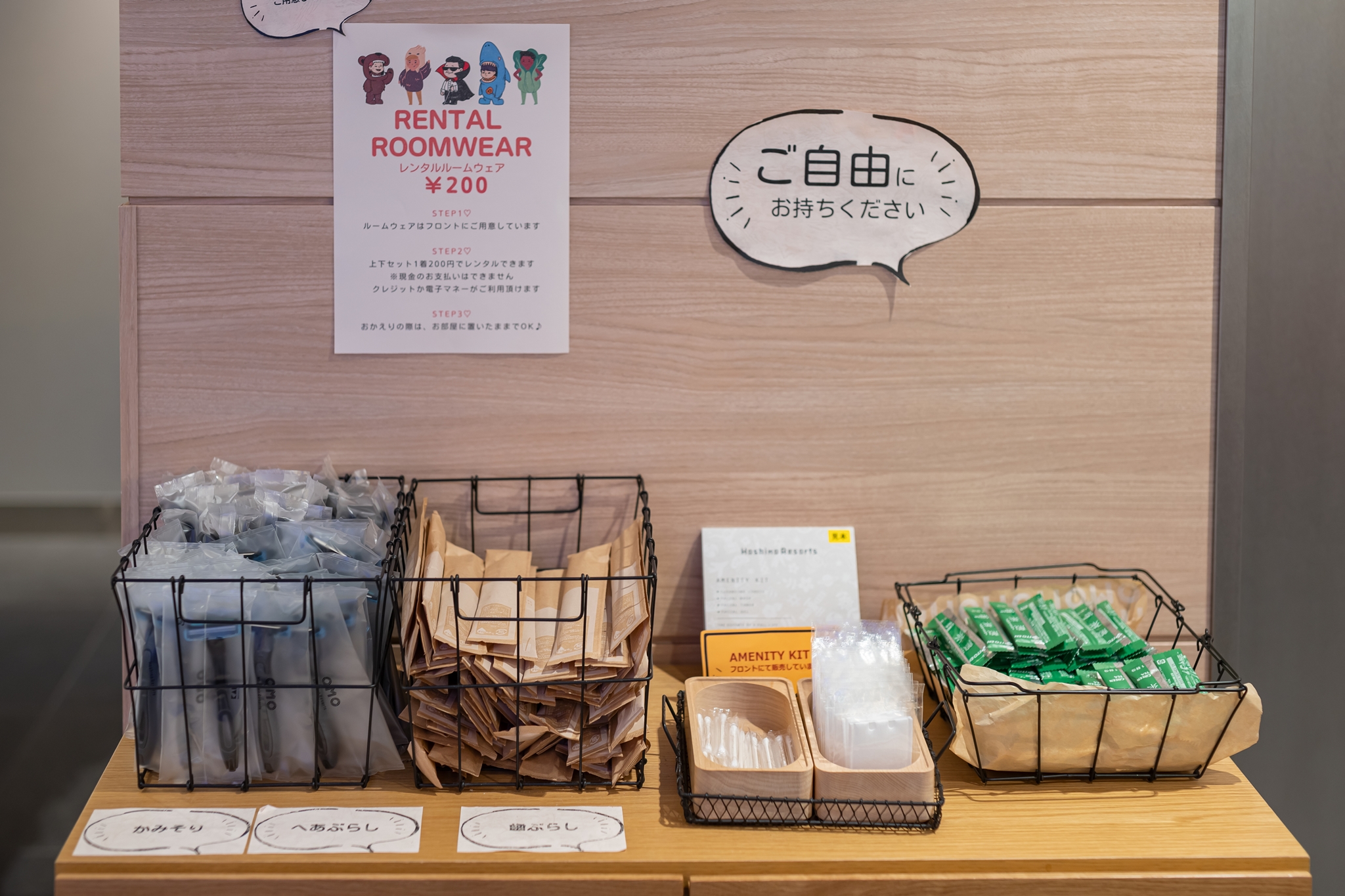 호시노 리조트는 요즘 일본에서 유행하는 SDGs(지속 가능 개발 목표) 를 실천하는 명목으로 일회용품을 객실에 두지 않습니다. 대신 카운터 옆에서 자유롭게 가져갈 수 있습니다.
