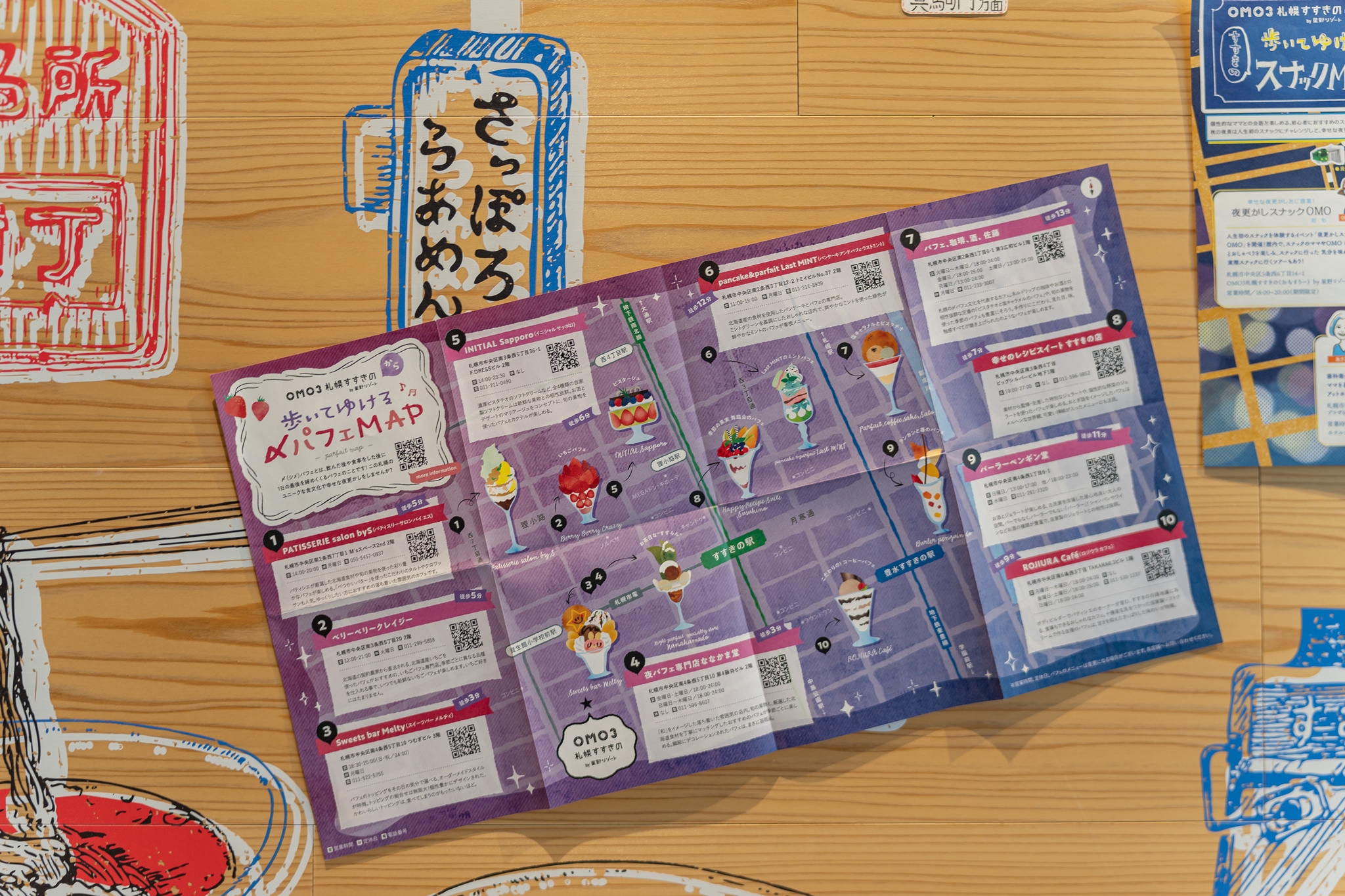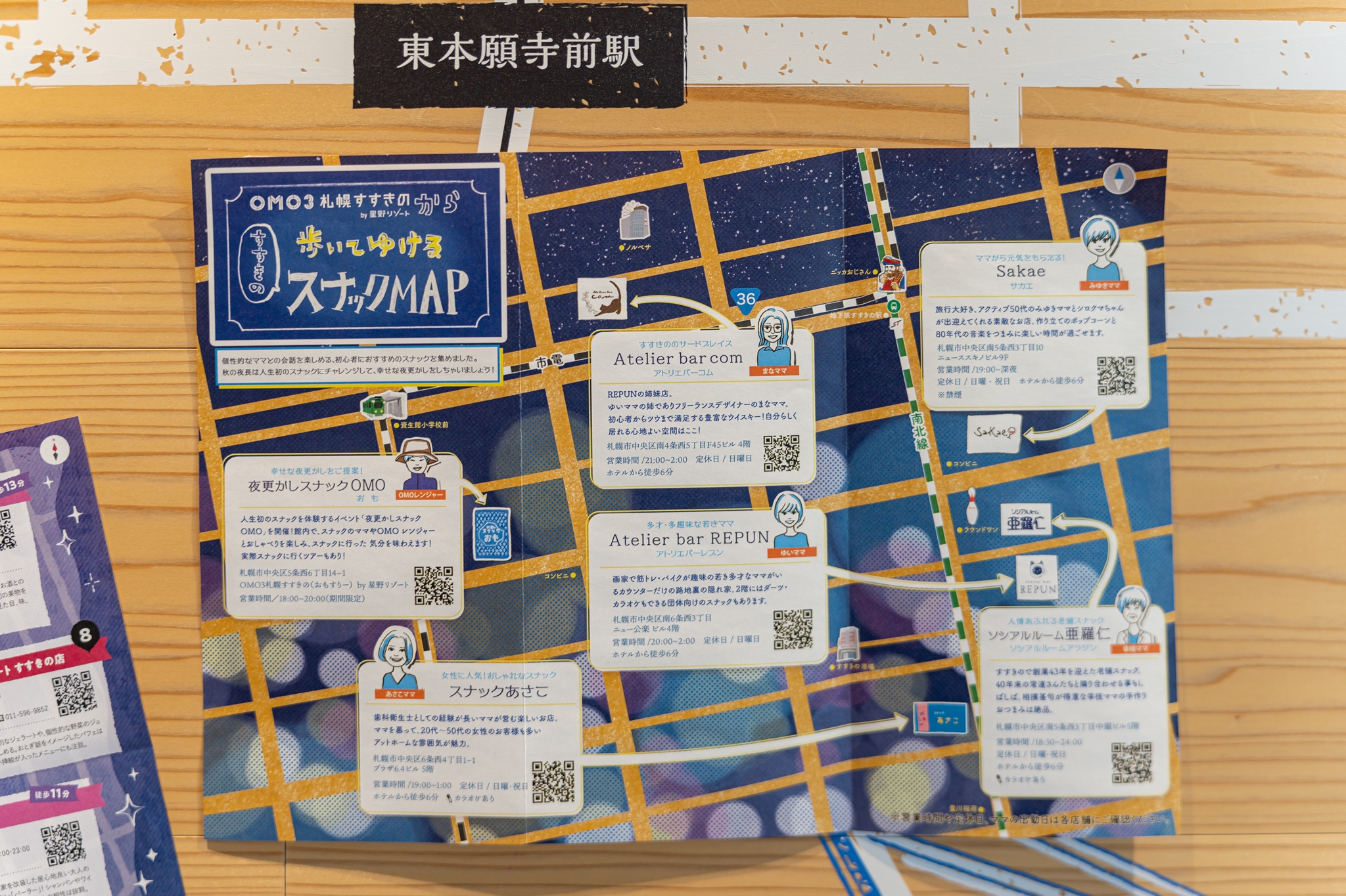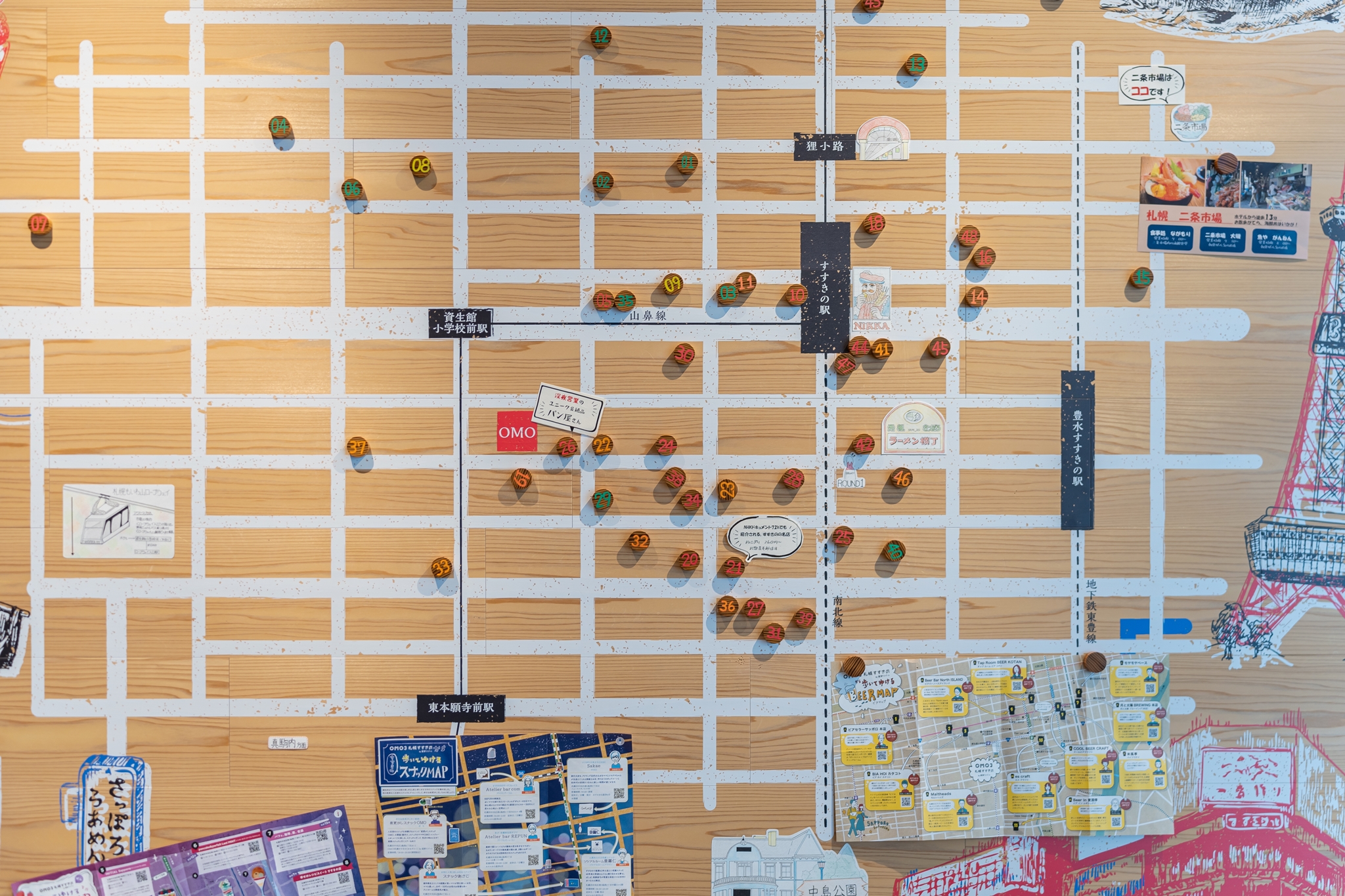 주변 명소는 주로 카페, 레스토랑, 바, 이자카야, 라멘가게 등이 많으며 삿포로가 라멘으로 유명하여 라멘 특집 안내도 있었습니다.