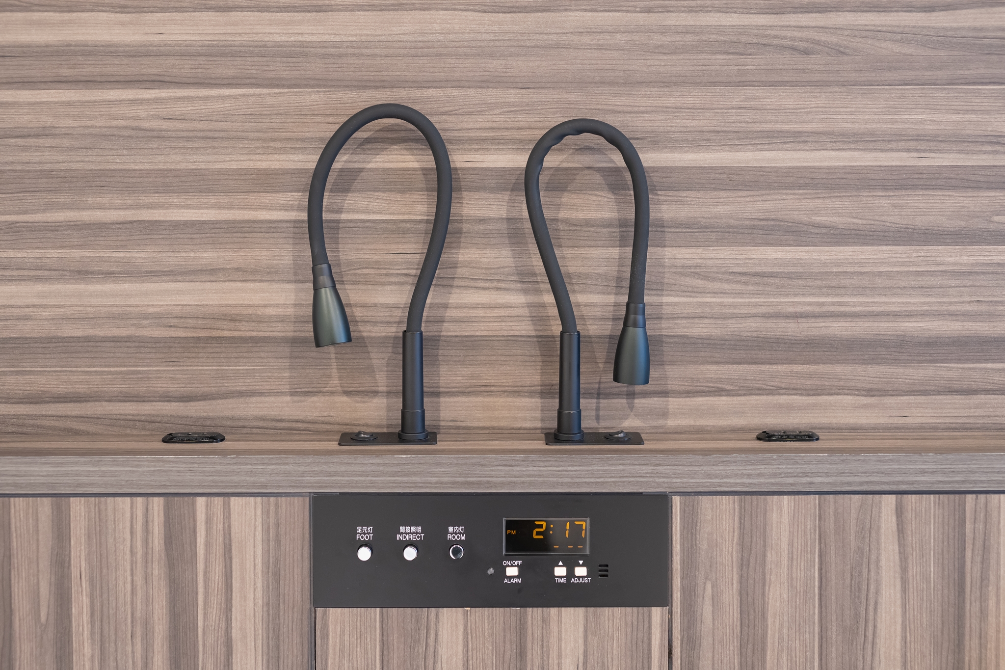 침대 머리에는 콘센트와 독서용 조명, 실내 조명 조절 버튼, 알람시계가 있었습니다.