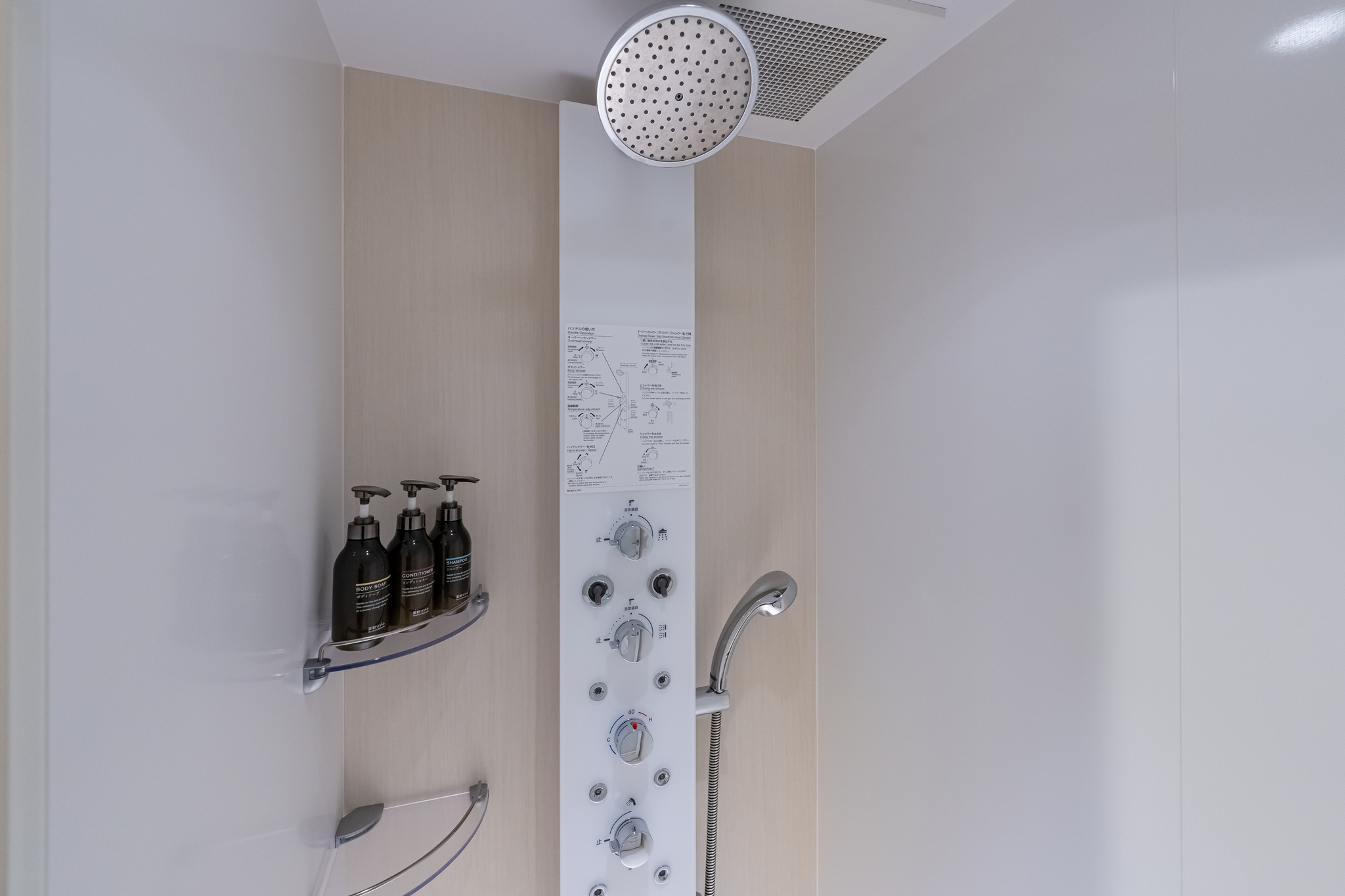 욕조가 없는 대신 샤워실이 있으며 샤워실에는 다양한 샤워가 가능한 샤워기가 있었습니다.