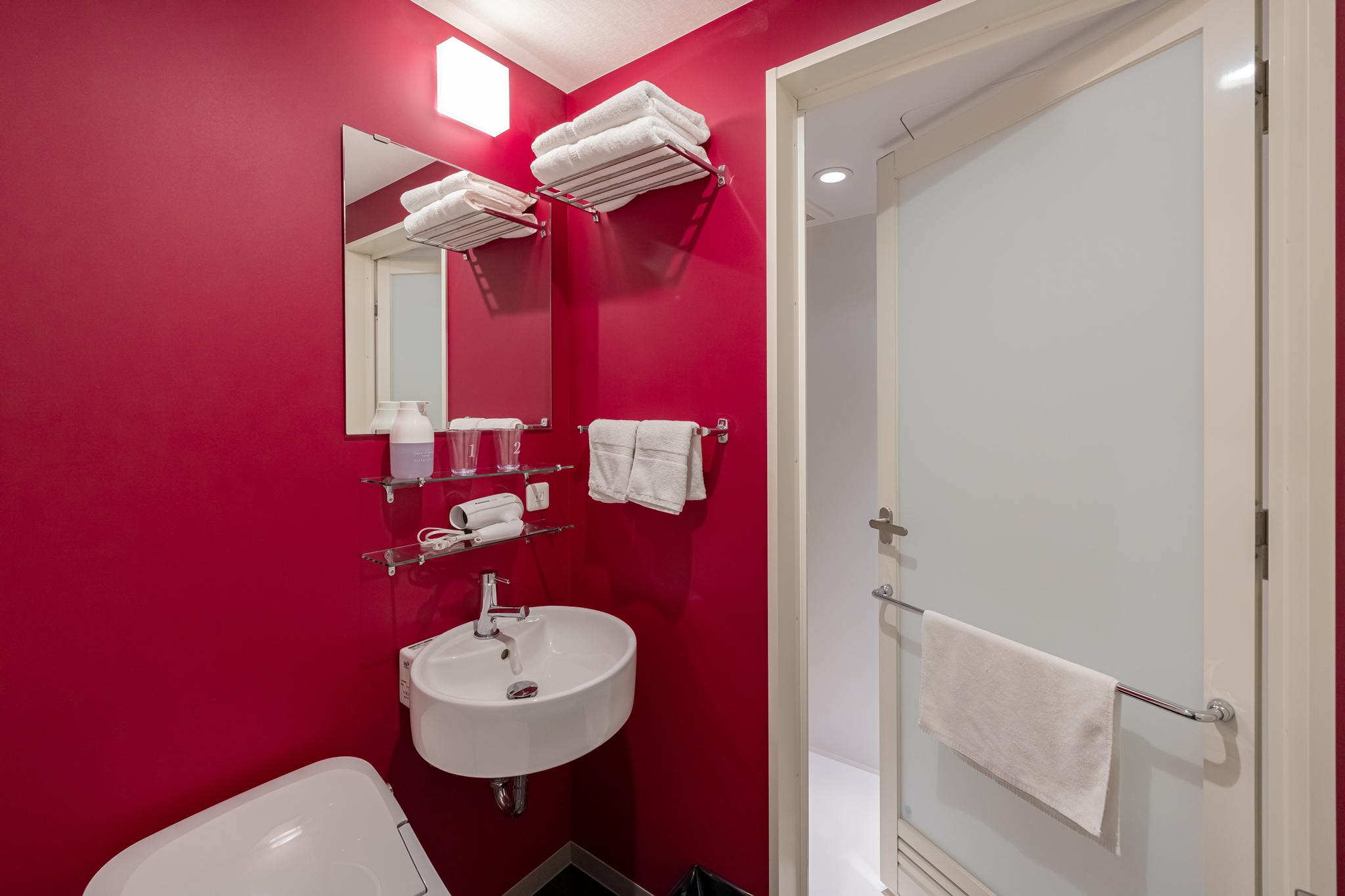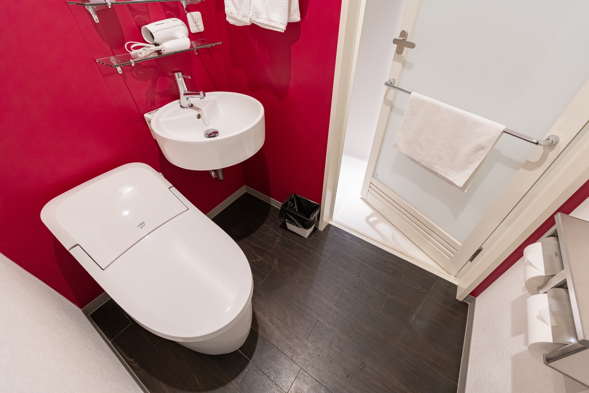 욕조는 샤워실과 화장실로 나뉘어 있으며 빨간 벽지가 인상적 입니다.