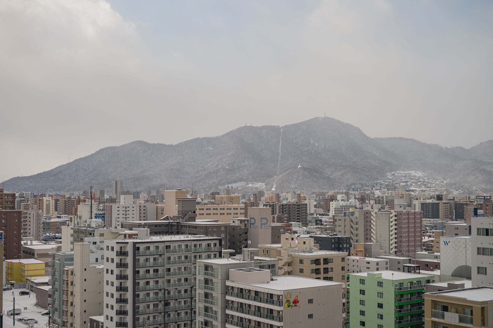 호텔 창 밖은 눈으로 뒤덮인 삿포로 시내가 보입니다.