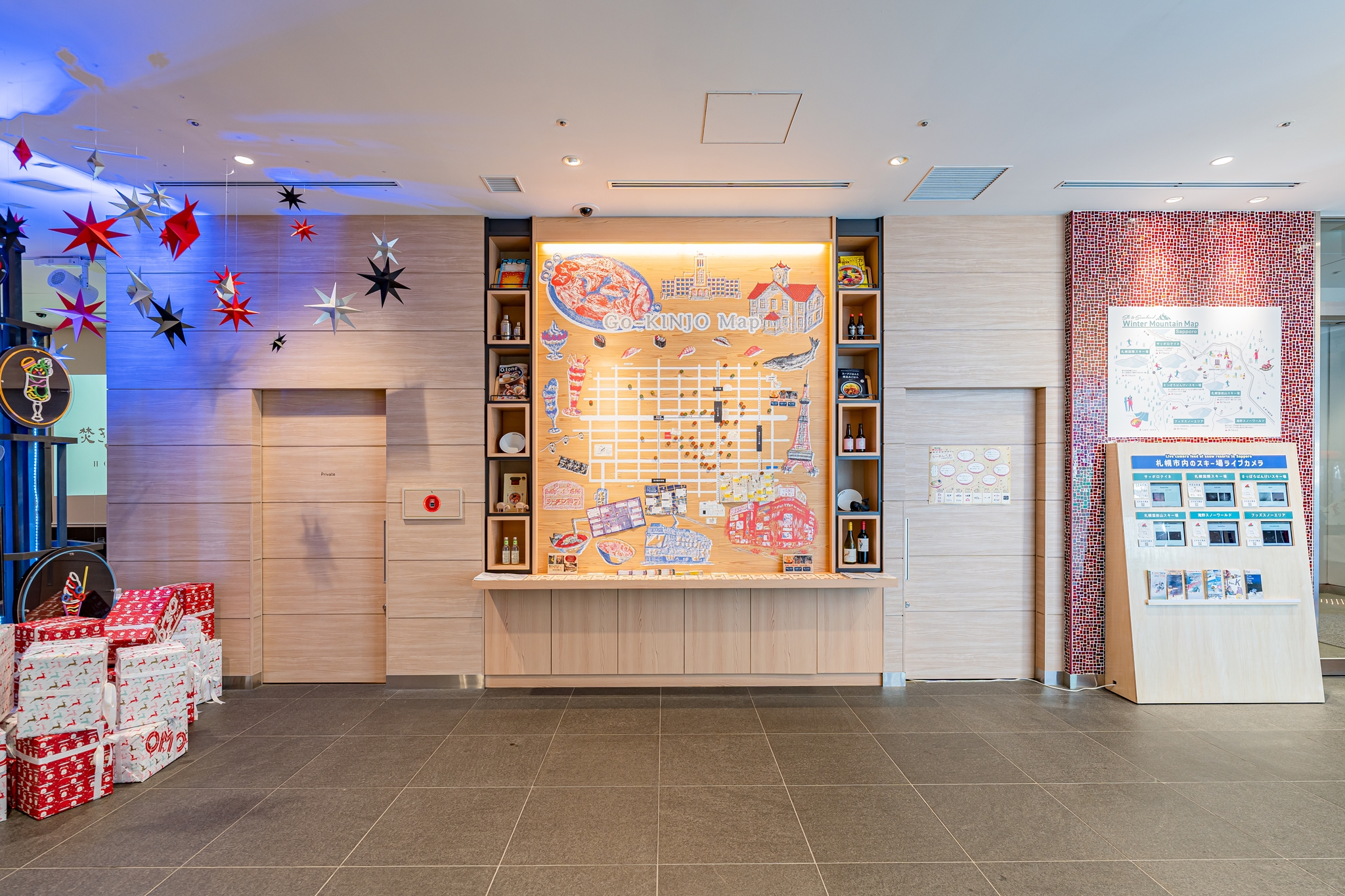 로비 정면에는 호시노 리조트 오모 브랜드의 특징 중 하나인 고 킨조 맵이 있습니다.