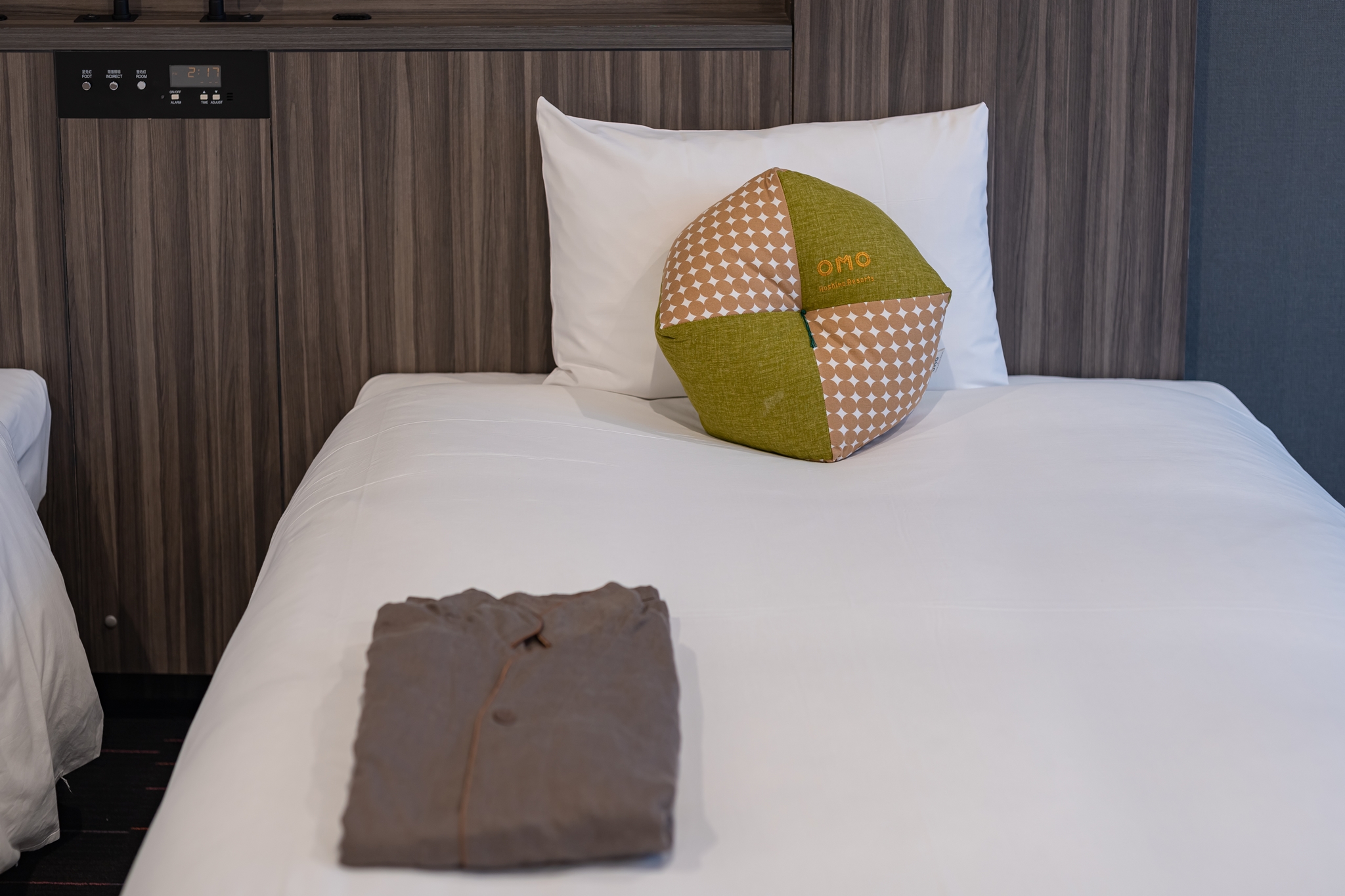 침대 위에는 실내복과 귀여운 오모 쿠션