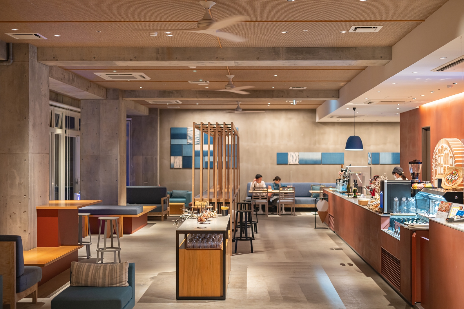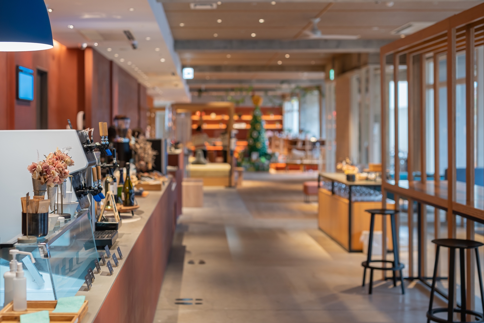 카페 겸 로비, 숙박객들의 다용도 공간에서 체크인이 가능하며 넓은 1층의 공간을 자유롭고 다양하게 이용할 수 있습니다.