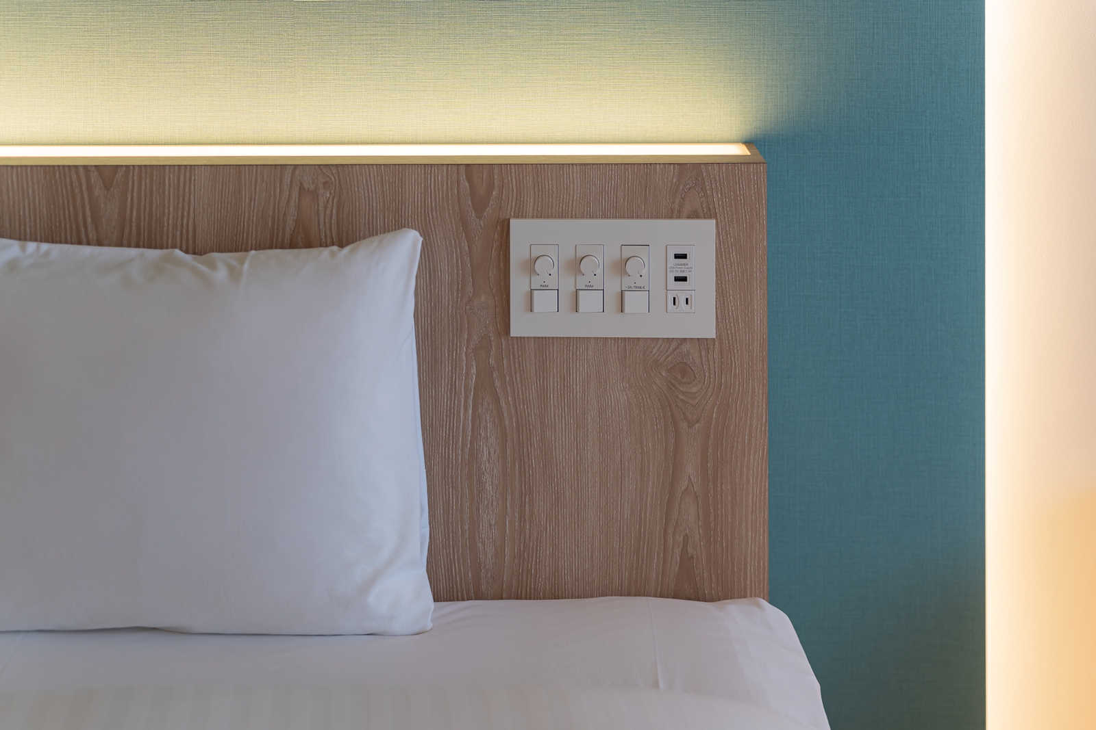 침대 머리에는 객실의 조명과 콘센트 USB 포트가 있어 편리합니다.