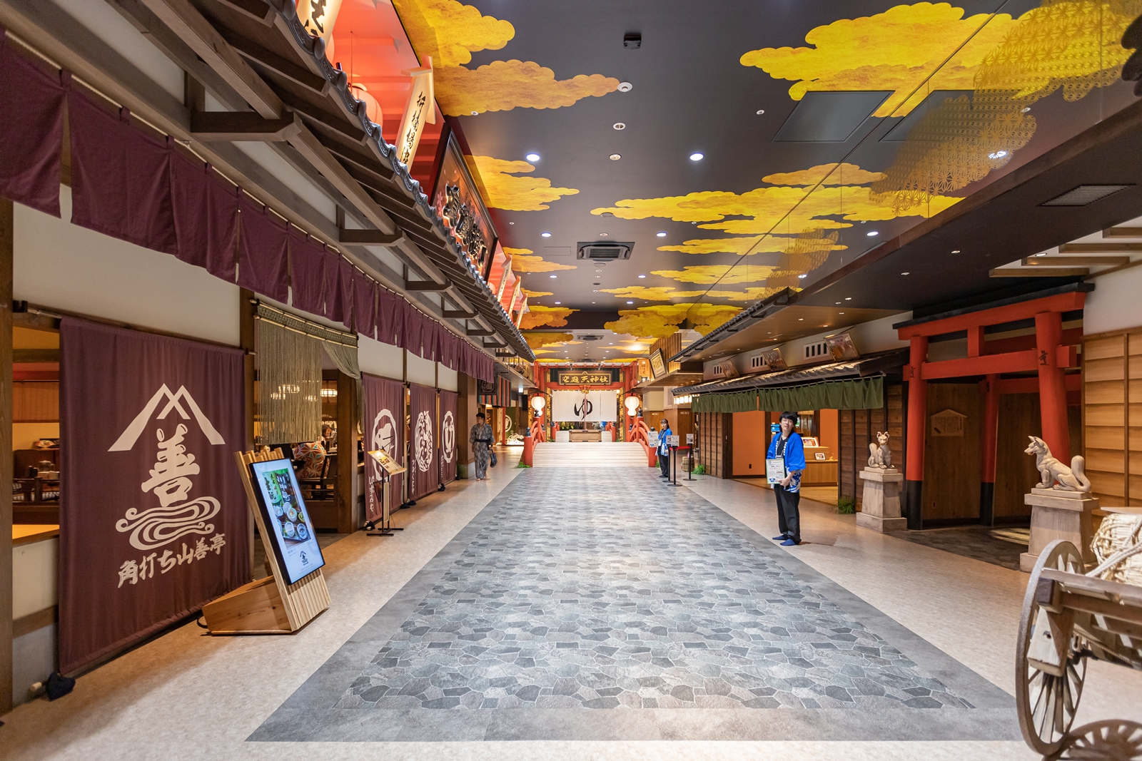 정면에 온천의 번영을 기원하는 소라니와텐신사(空庭天神社) 와 함께 곧게 뻗은 길이 있습니다.