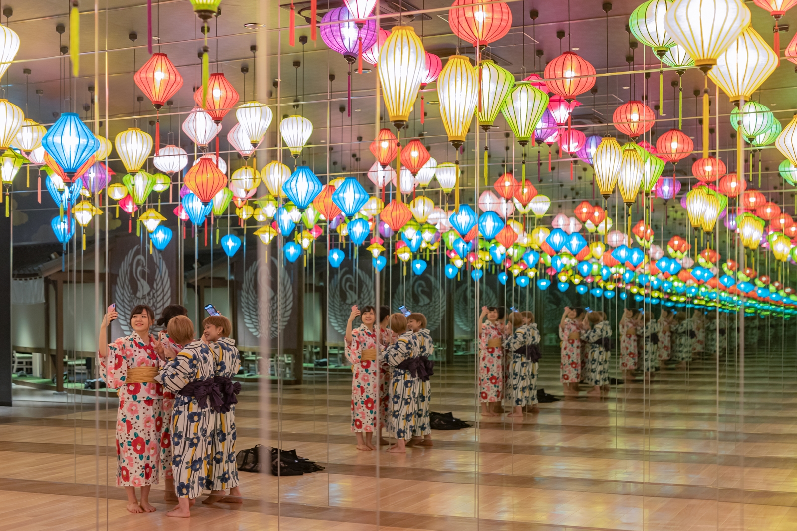 온천으로 들어가기 직전의 통로는 거울과 다양한 색의 등으로 꾸며져 있어 인스타 명소로 유명합니다.