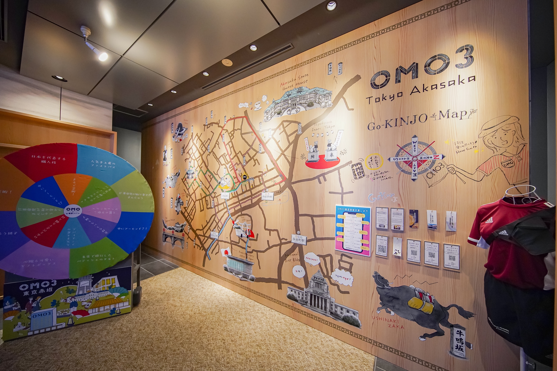 일본을 대표하는 럭셔리 호텔 브랜드 호시노 리조트의 시티 호텔로 교통이 편리하고 비지니스 수요가 많은 아카사카에 2022년 4월에 오픈하였습니다. OMO 베이스라는 프론트 겸 라운지 역활을 하는 공용 공간이 있으며 이곳에는 인근 주변의 숨겨진 매력을 소개하는 고킨죠 맵이 그려져 있어 주변 여행에 도움을 받을 수 있습니다. 직원들이 직접 발품을 팔아 만든 지도와 정보 카드가 있으며 OMO 레인저 라는 안내 시스템이 있어 직원과 함께 주변의 명소를 둘러볼 수 있는 경험도 제공합니다. 혼자서 가기 힘든 바나 살롱, 잘 알려지지 않은 주변 맛집, 사진의 명소들을 안내하니 안심하고 호텔 주변에서 다양한 체험을 할 수 있습니다.