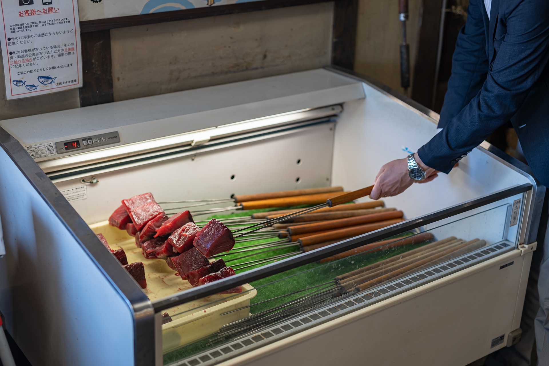 가다랑어는 짚불 구이 하기 좋은 크기로 조각나 꼬치에 끼워져 있었습니다.