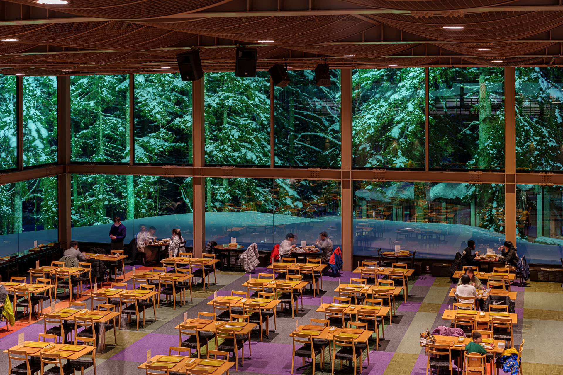 다음날 아침 조식을 먹기 위해 리조나레 토마무와 연결되어 있는 숲의 레스토랑 니니누푸리를 찾았습니다. 니니누푸리는 아이누어로 나무로 둘러싸인 숲을 의미하며 이름처럼 레스토랑 주변이 눈으로 가득한 나무들로 둘러싸여 있습니다. 홋카이도의 신선한 식재료로 만든 다양한 요리를 맛볼 수 있으며 연어와 연어알, 오징어 등 다양한 해산물을 마음껏 토핑해서 먹을 수 있는 해산물덮밥이 인기입니다.