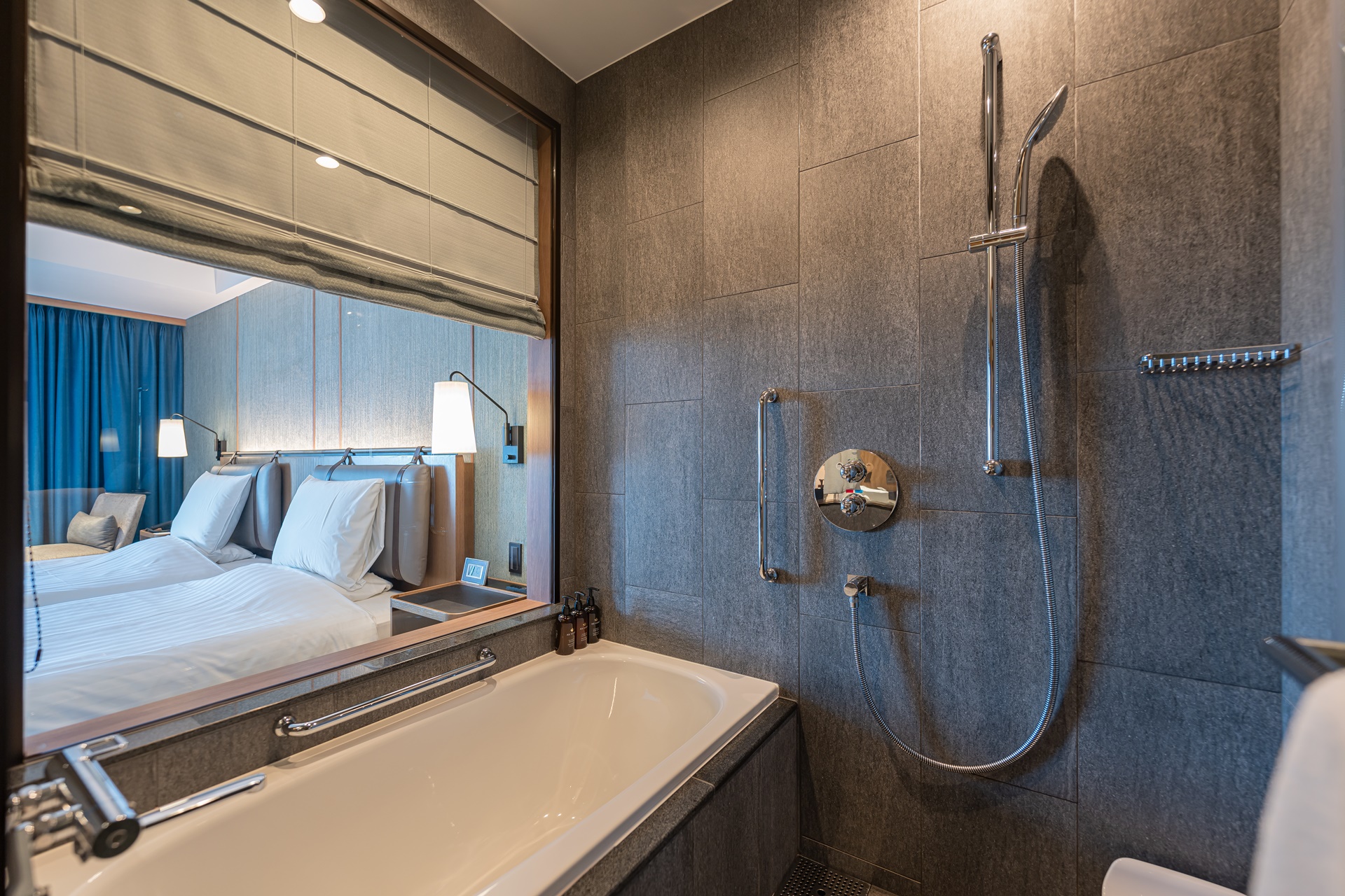 욕조도 넓은 편이며 욕조에서 침실이 보입니다.