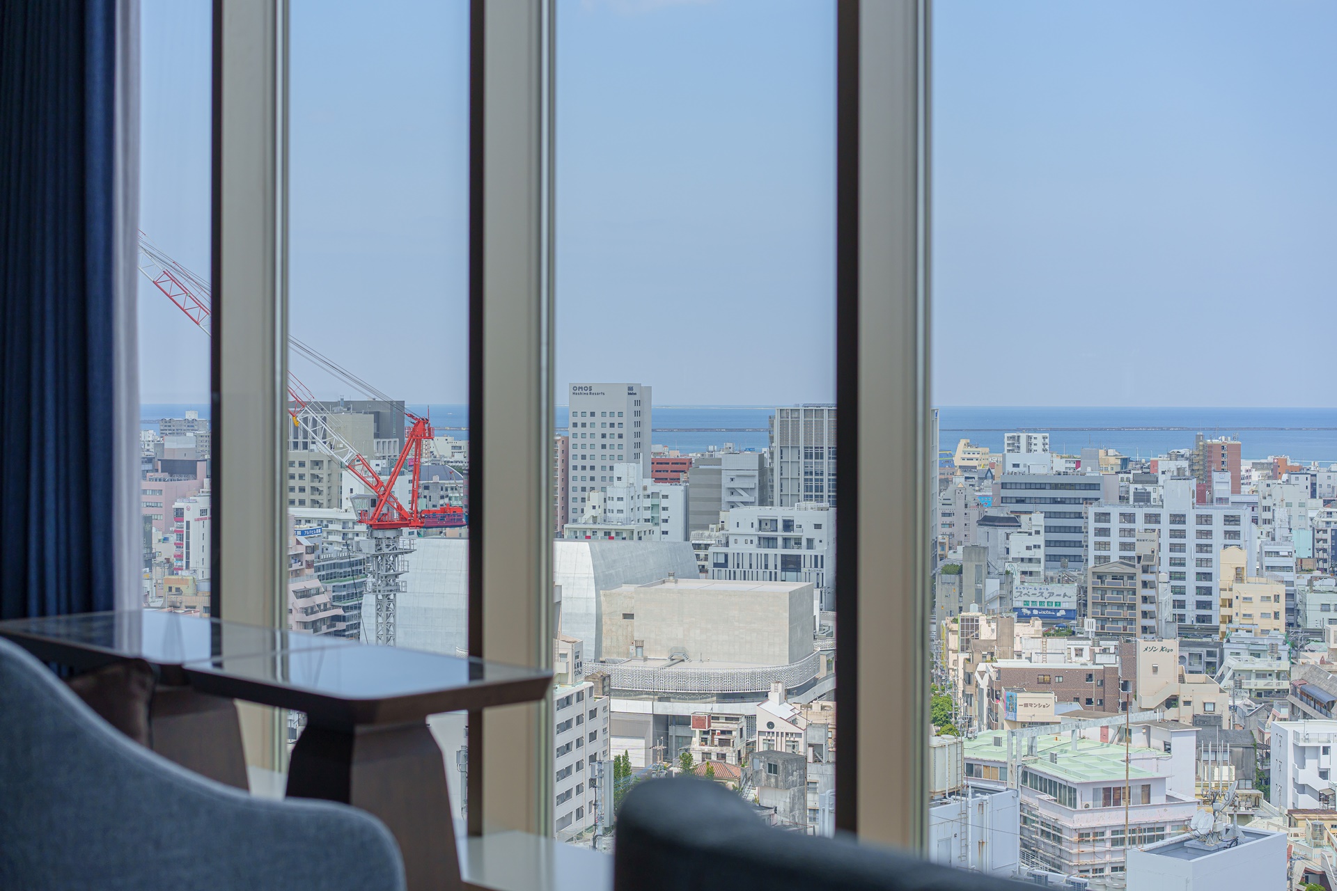 창 밖으로는 오키나와 해변이 보이는 멋진 뷰가 있습니다.