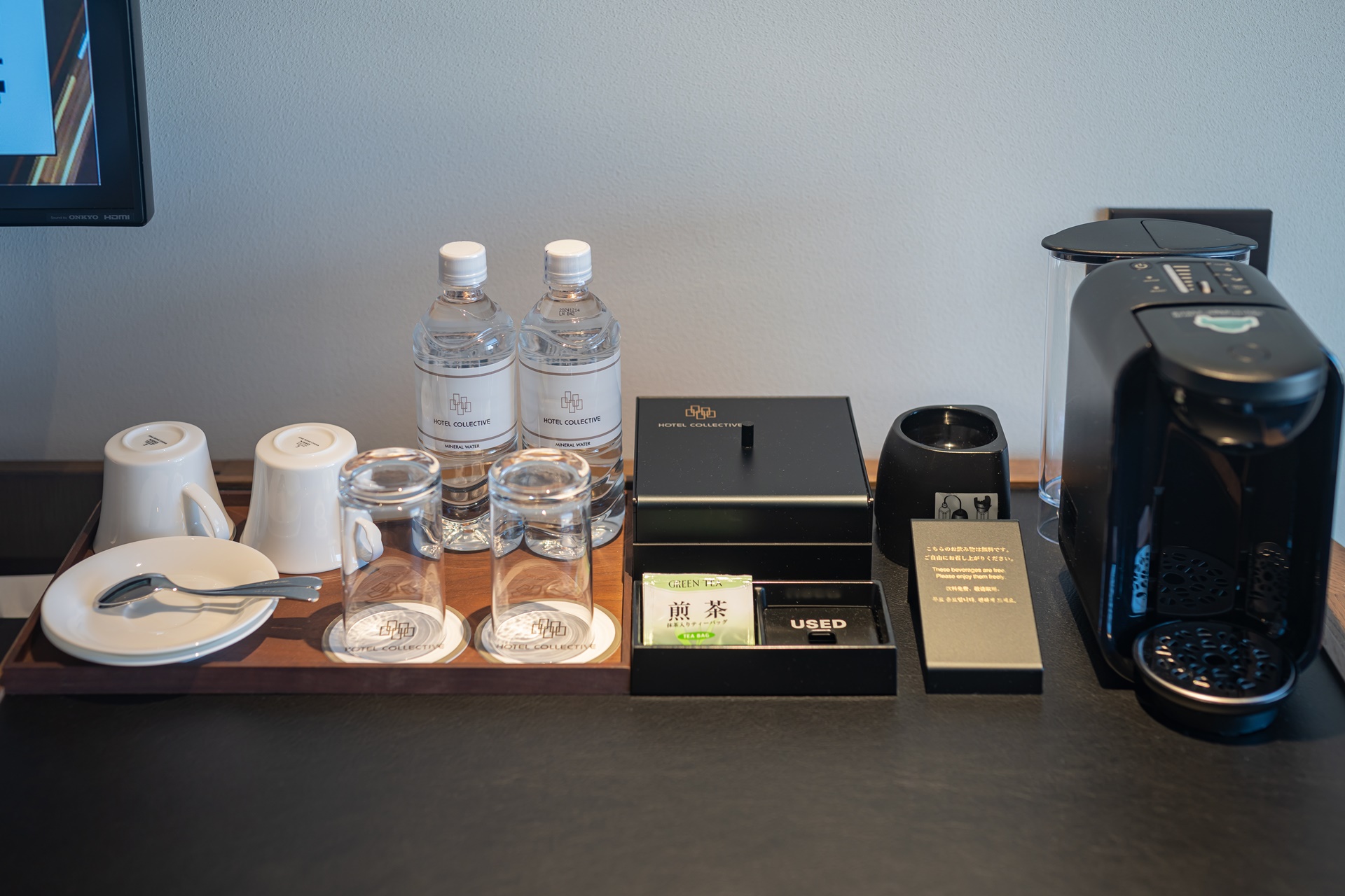 생수2병, 커피, 캡슐커피 머신, 머그컵 등