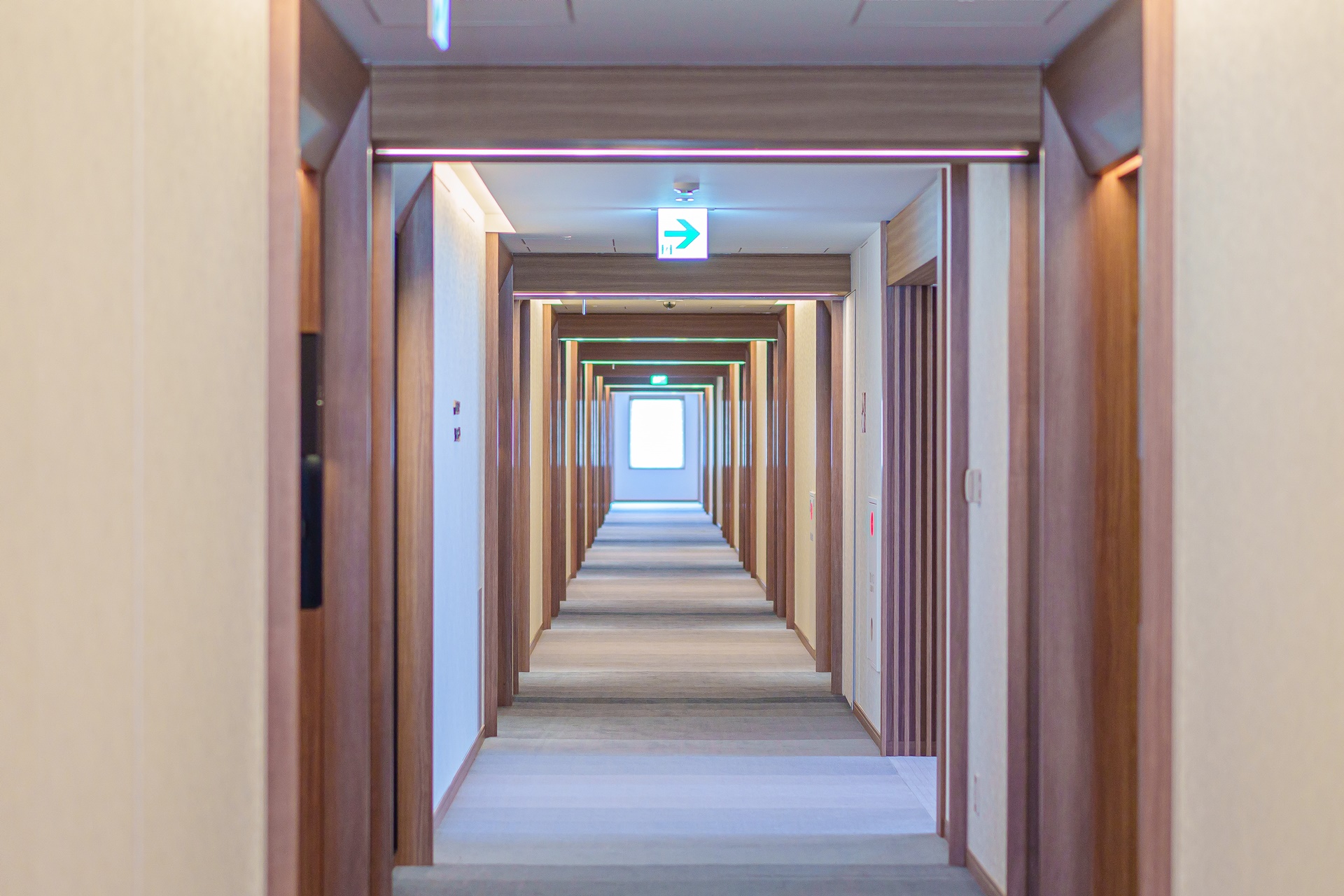 긴 복도 양 옆으로 수 많은 객실이 있습니다.