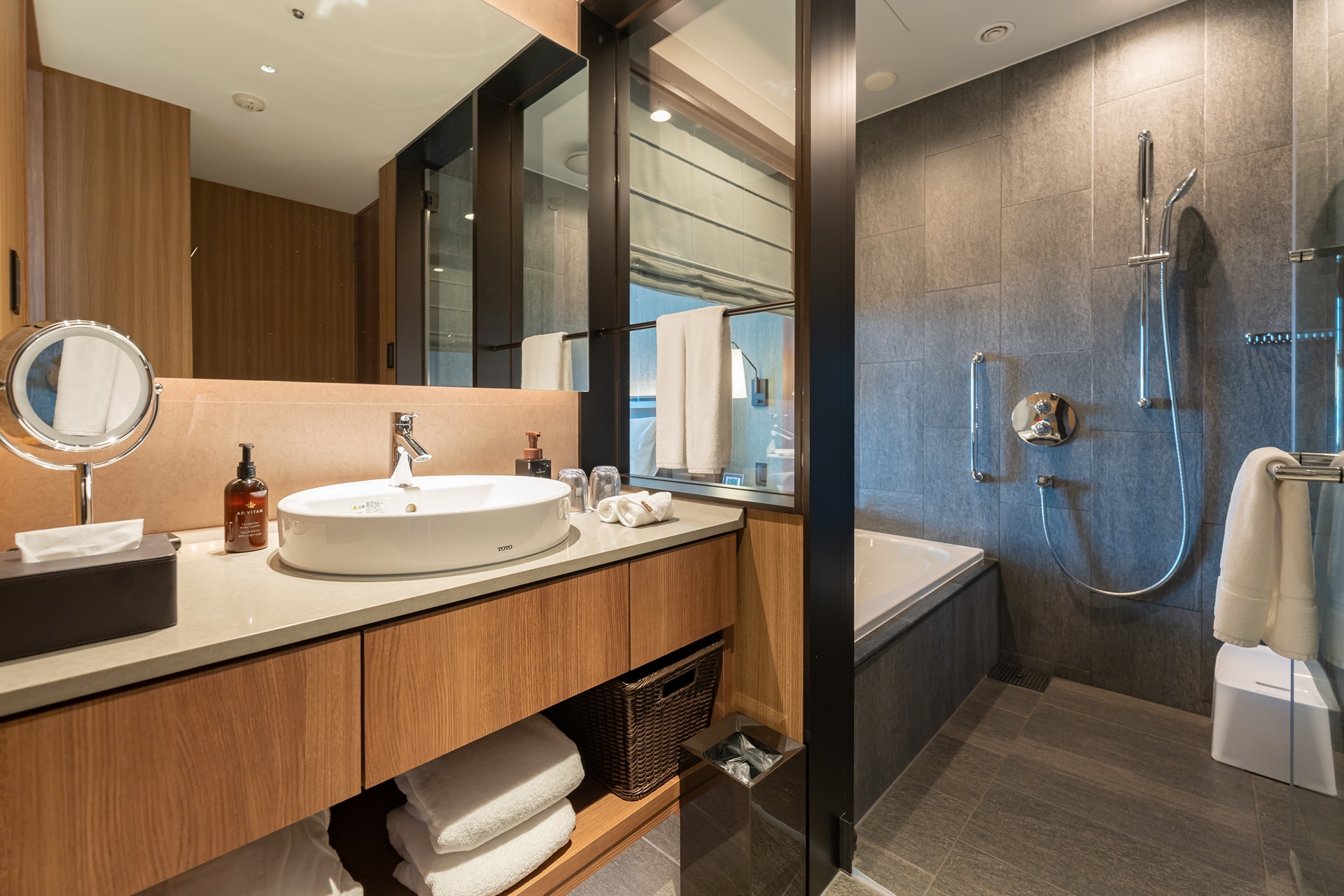 욕조는 세면대와 욕조, 사워실이 잘 분리되어 있고 넓습니다.