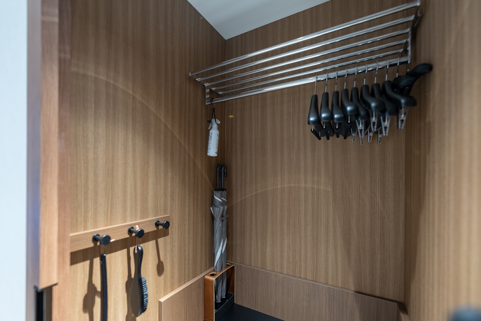 옷장이 제법 넓습니다. 옷걸이도 많고 냄새 탈취제, 장 우산 등이 보입니다.