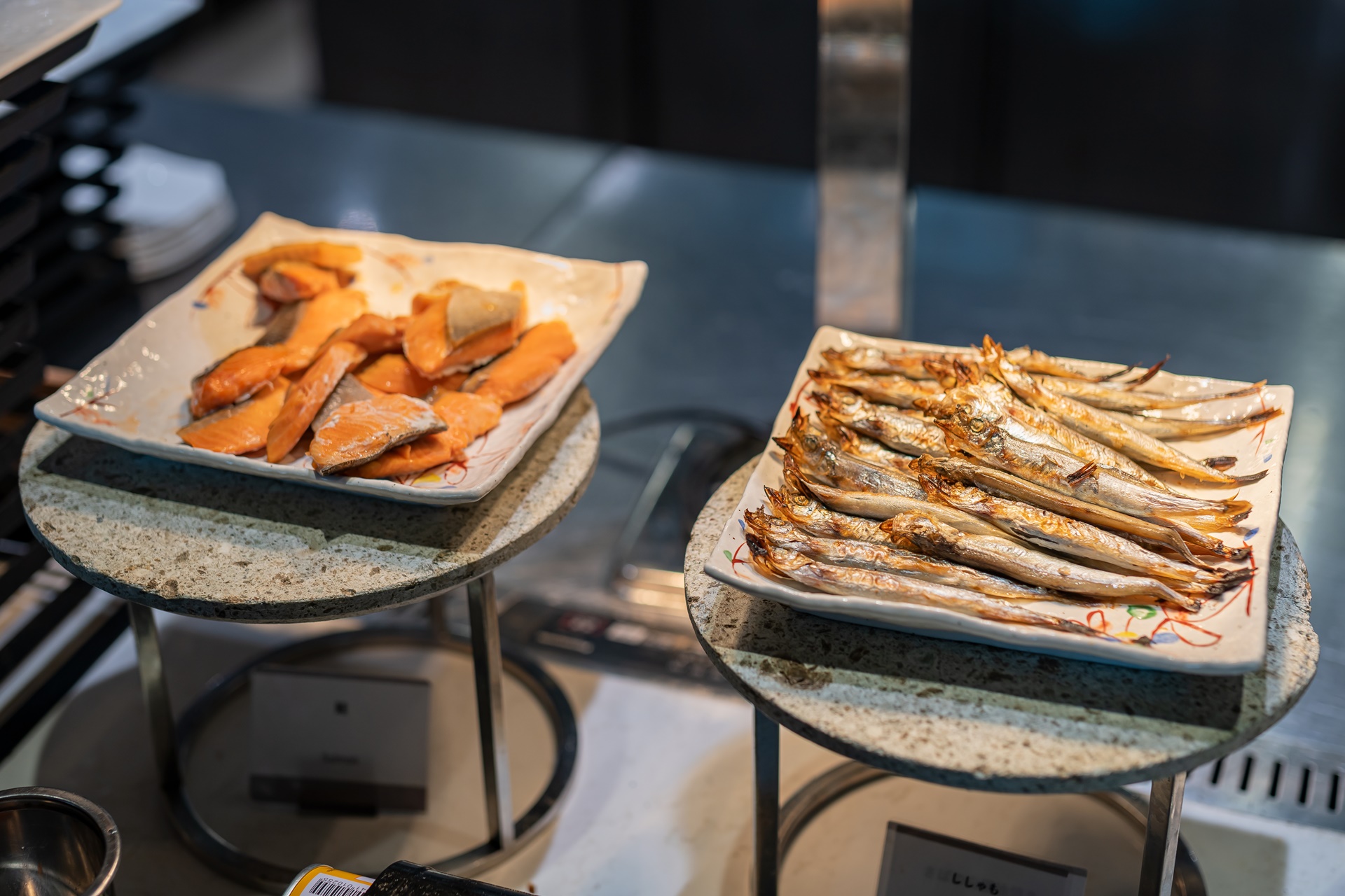 다양한 구이 요리가 있었고 앞에 조리기구가 있어 따뜻하게 하거나 더 구워서 먹을 수 있었습니다.
