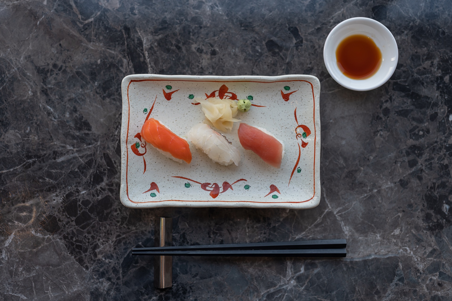 자리에 앉아 있으면 인당 한 접시씩 제공되는 초밥, 연어, 광어, 참치였던거 같습니다.