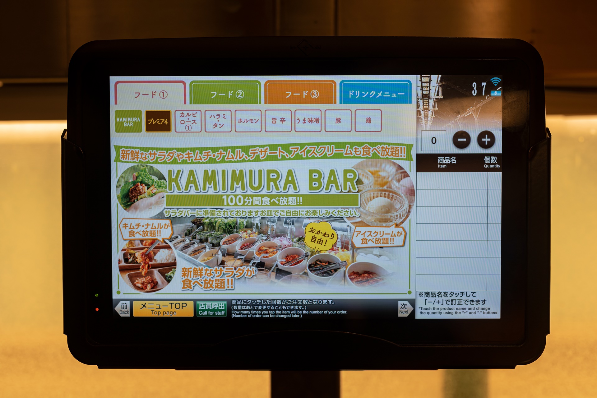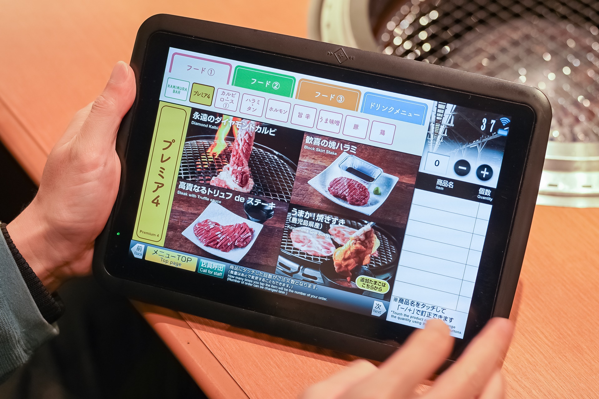 전자 메뉴를 찾아보니 불판 교환(網交換)이 있어 그 버튼을 누르니 직원이 불판을 갈아주었습니다.