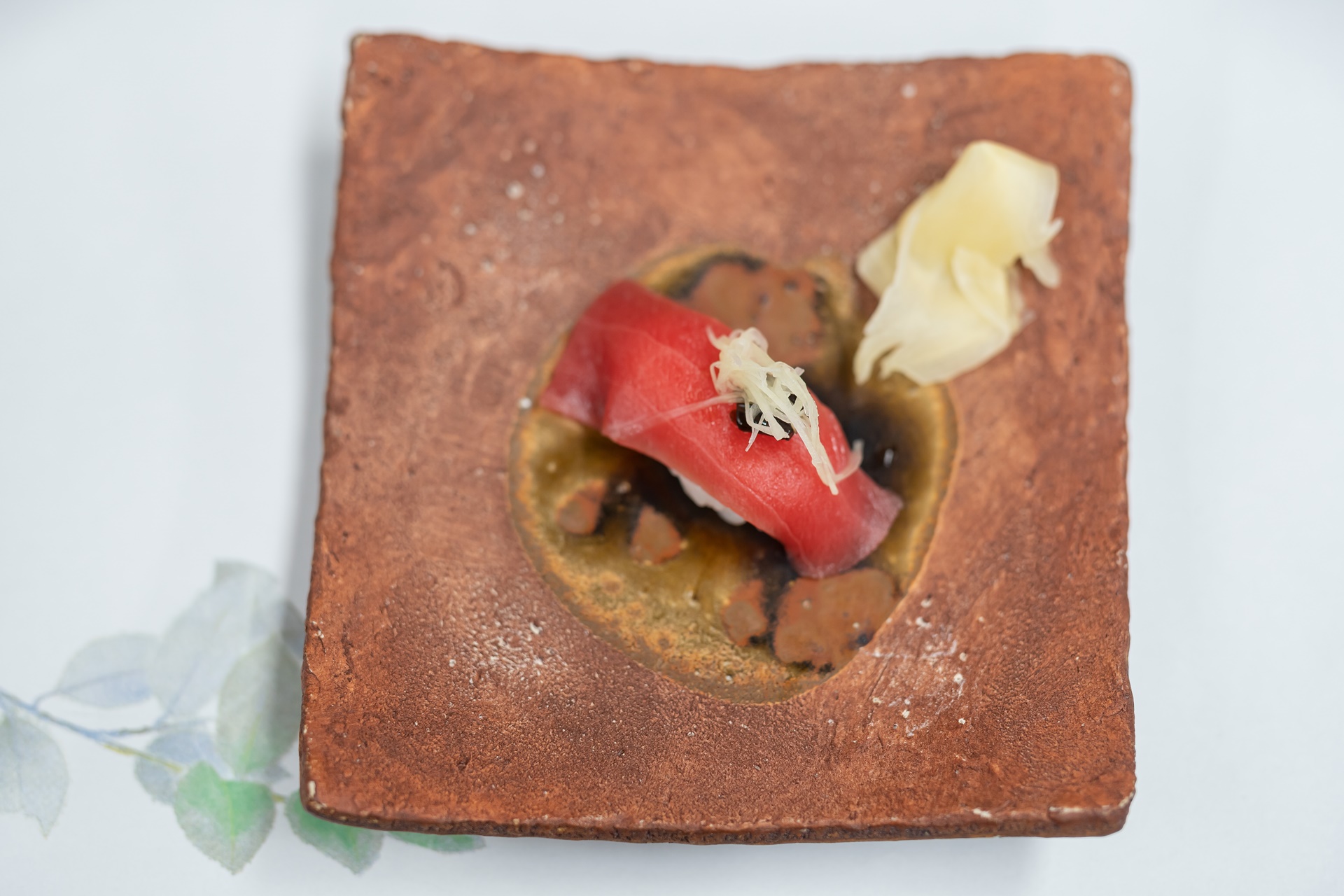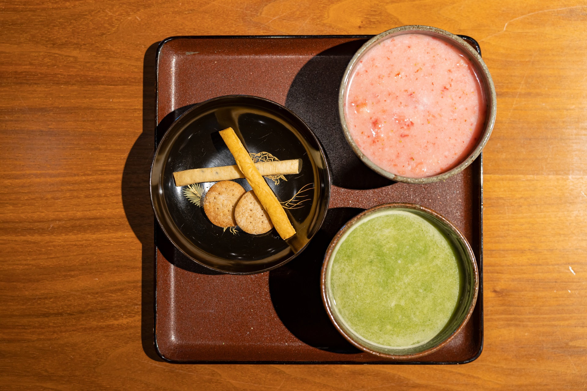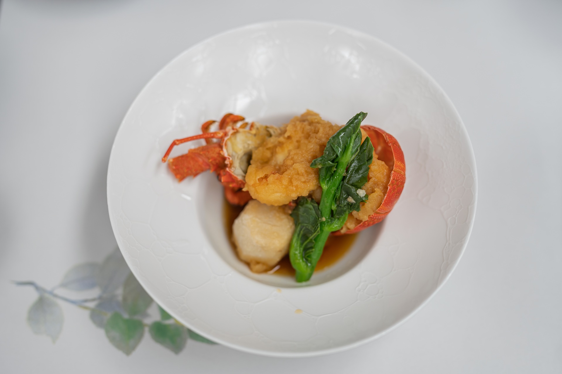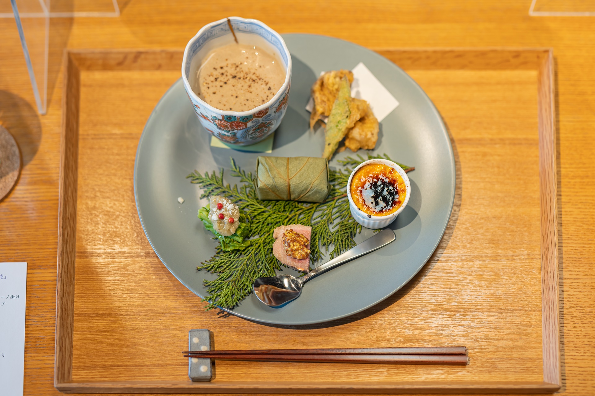 에피타이저인 튀김, 크램뷜레, 오리고기, 버섯스프, 감잎초밥