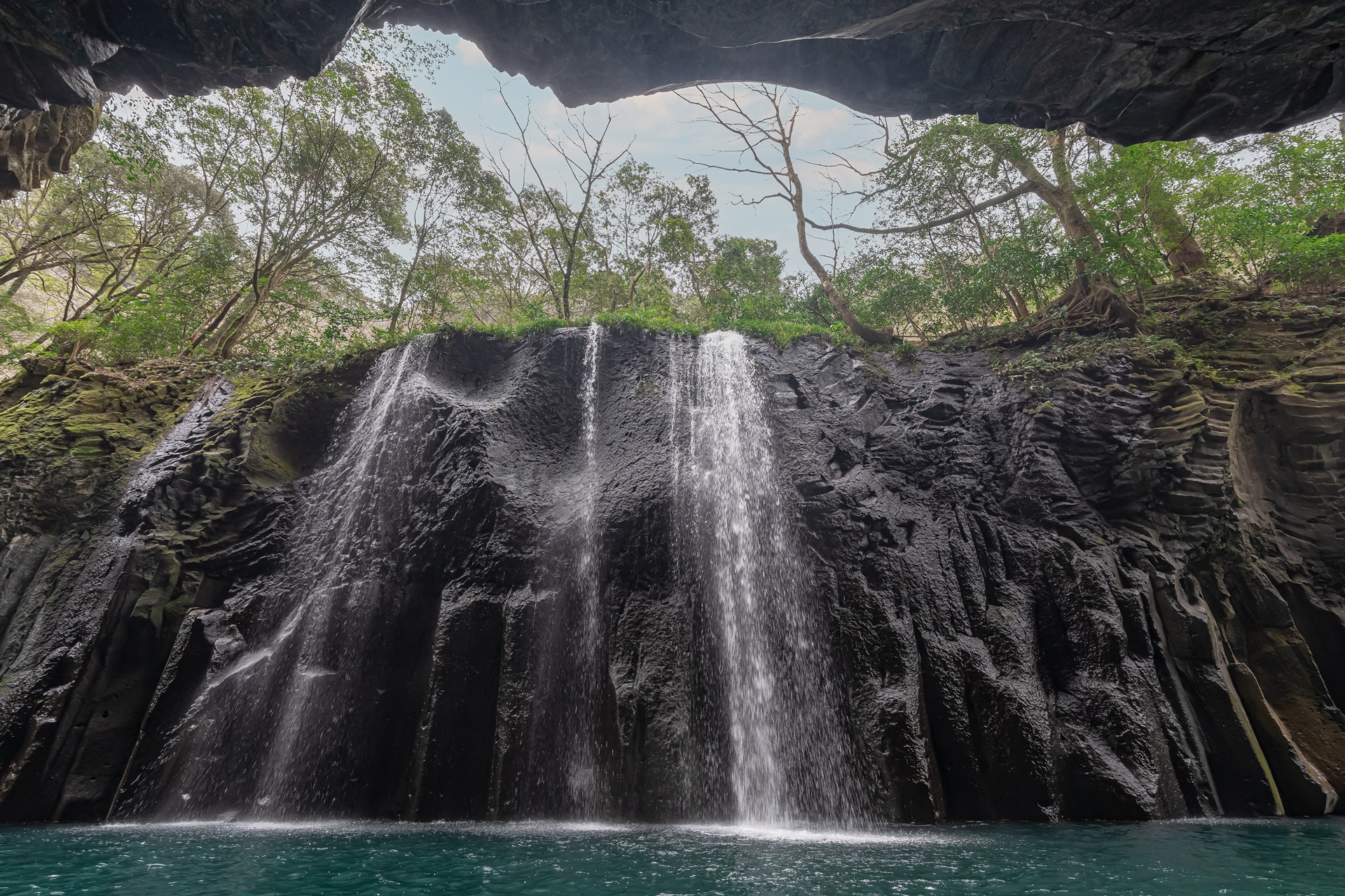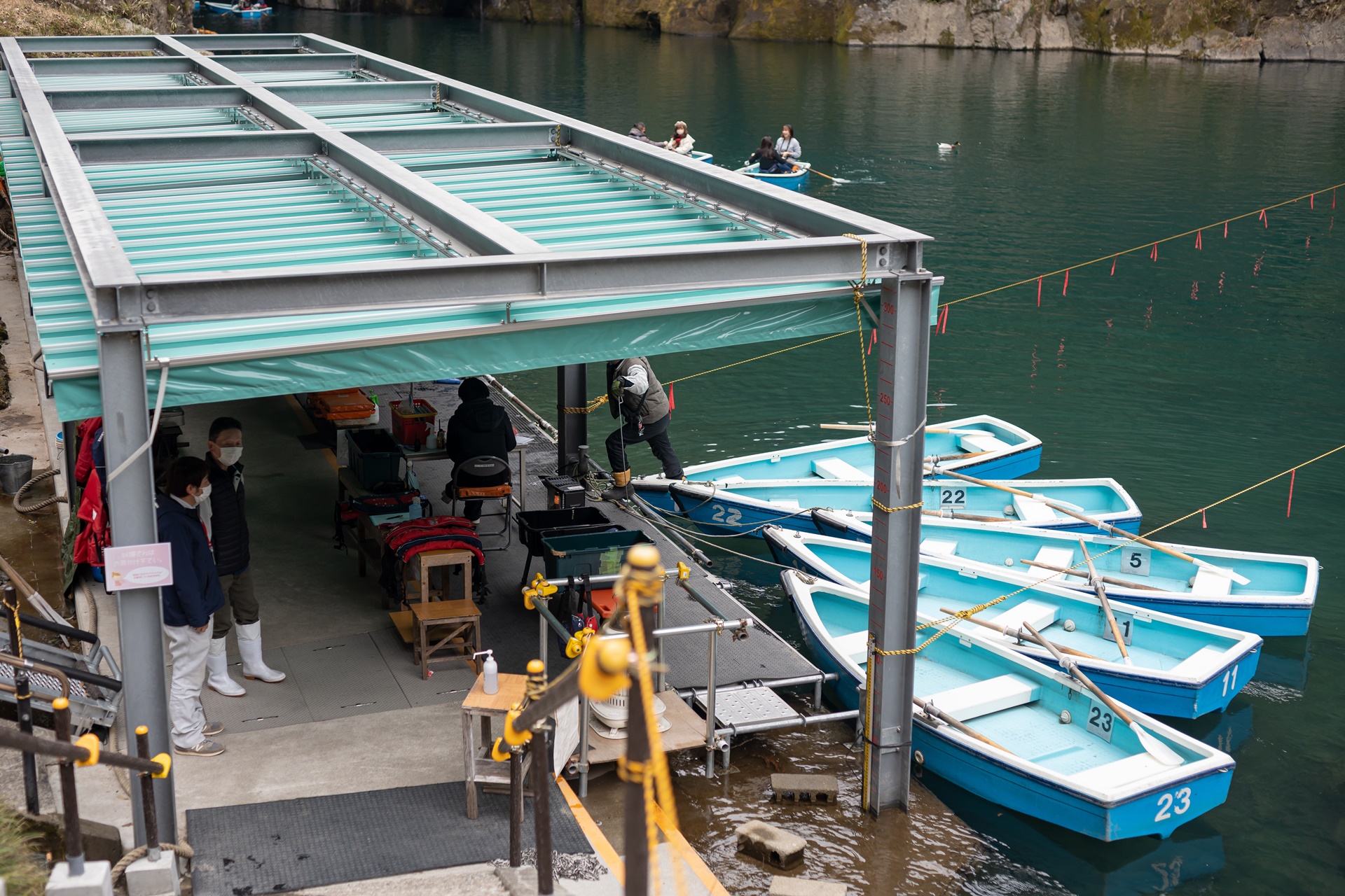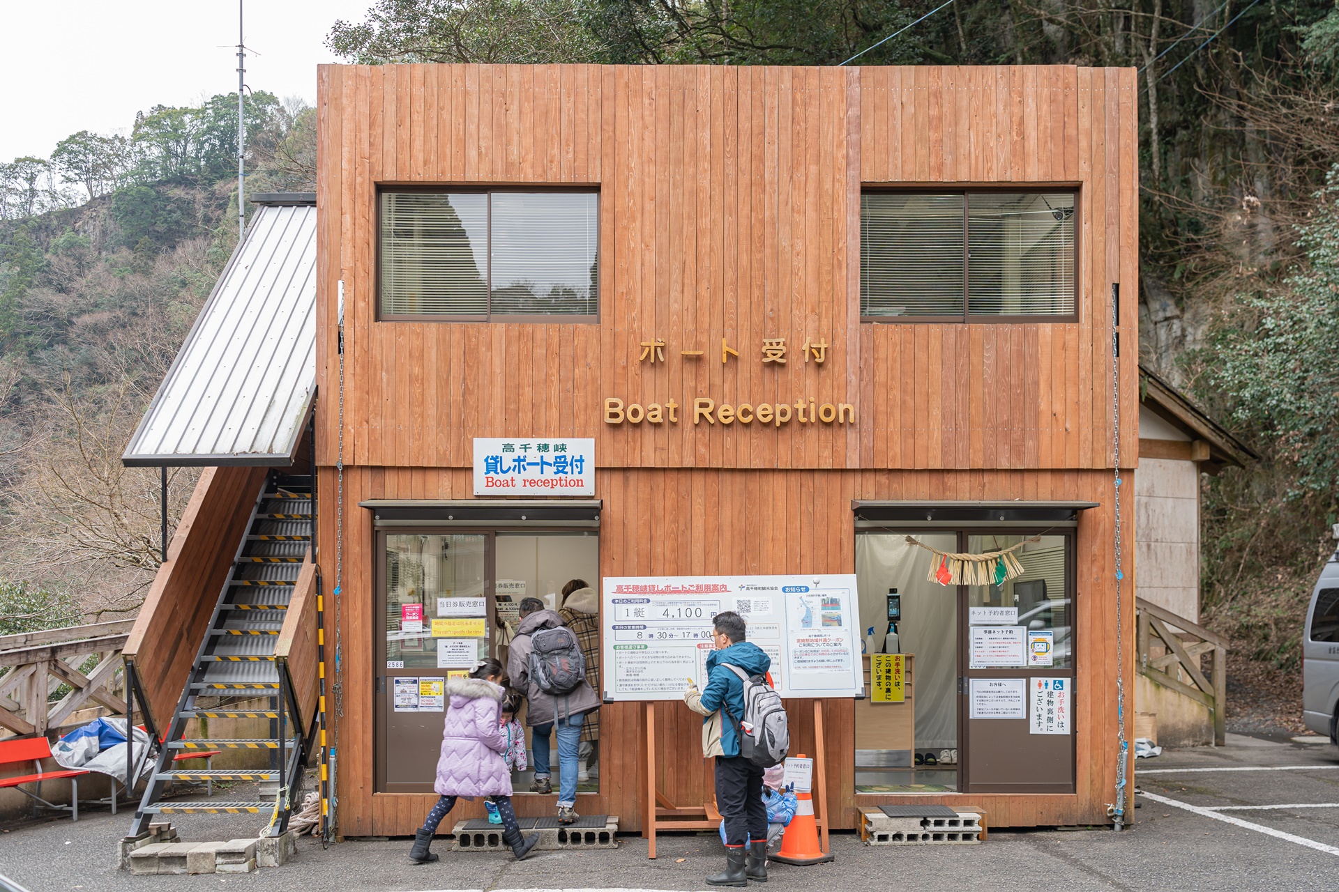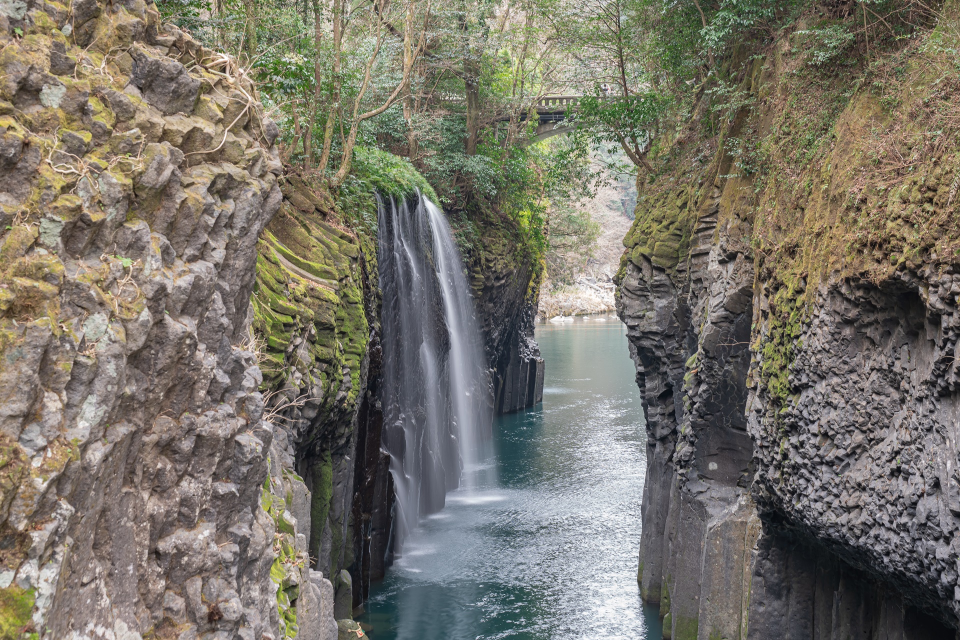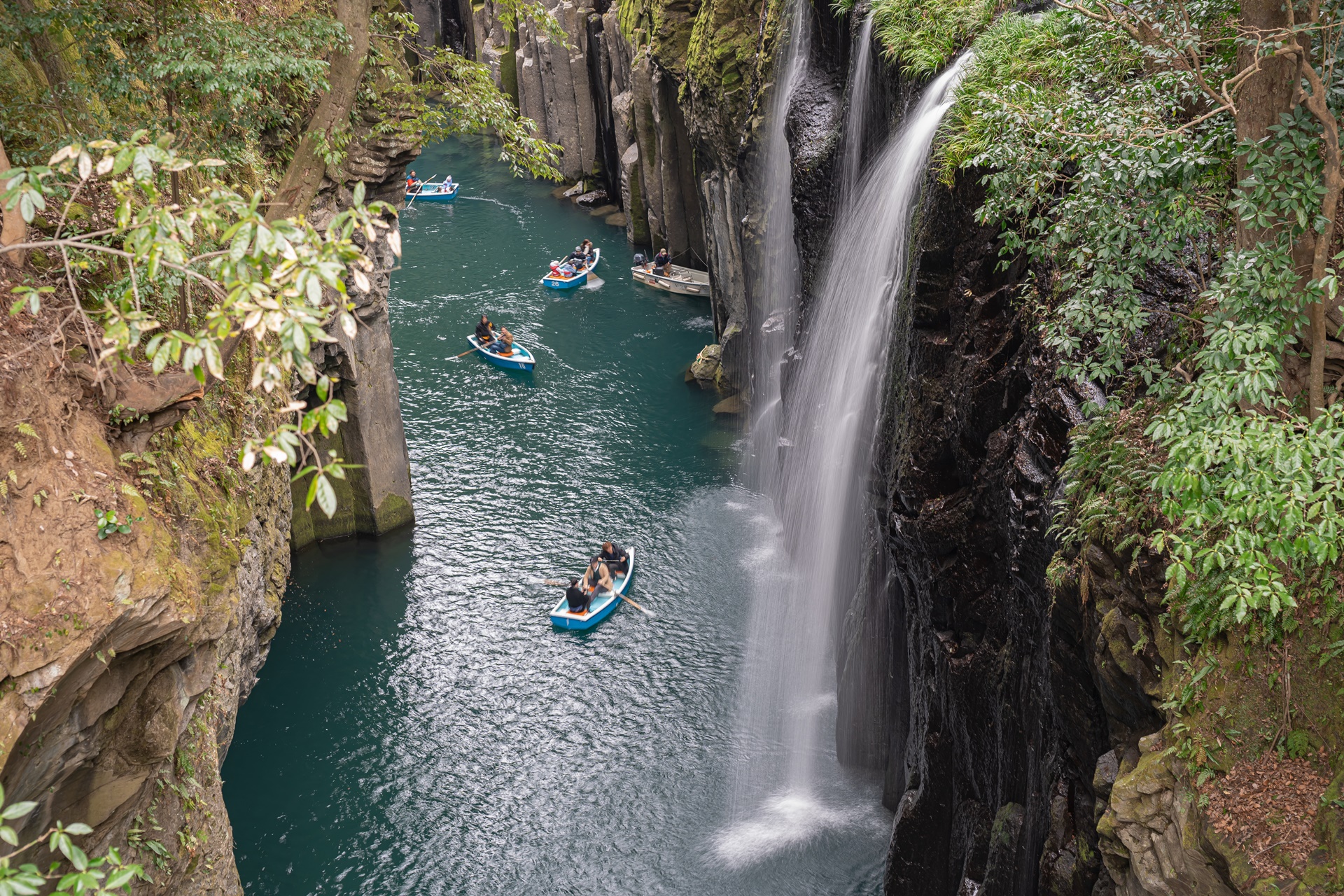 아소산의 폭팔 시 흘러내린 용암으로 이루어진 지대에 물이 흐르고, 침식작용이 시작되어 V자 모양의 깊은 계곡이 형성되며 생겨난 곳입니다. 협곡 사이로 유유히 흐르는 강과 물보라를 일으키며 떨어지는 마나이노 폭포(真名井の滝), 그 위에 띄운 나룻배 한 척이 수묵화의 한 장면을 보는 것 같은 멋진 풍경을 만들어냅니다.