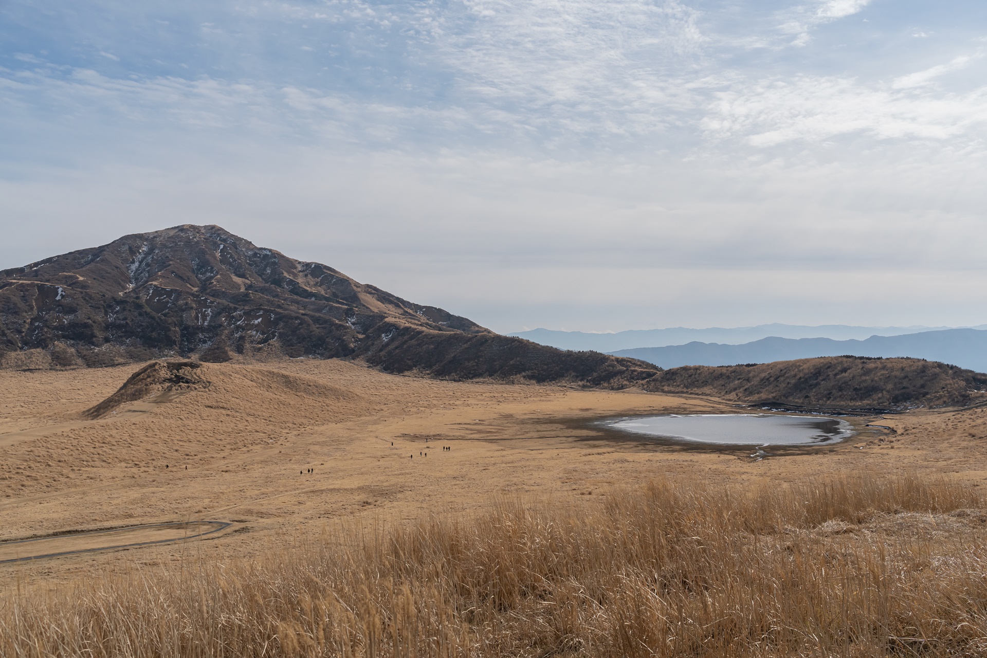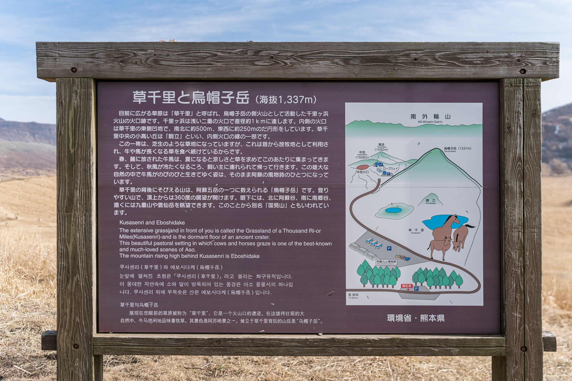 구사센리는 에보시다케(烏帽子岳) 기슭에 펼쳐진 약 1km의 초원으로 중앙에는 연못이 있고 여름에는 초원으로 소와 말들이 풀을 뜯는 곳입니다. 겨울이라 소와 말은 없었지만 아소산과 함께 멋진 풍경을 감상할 수 있었습니다.