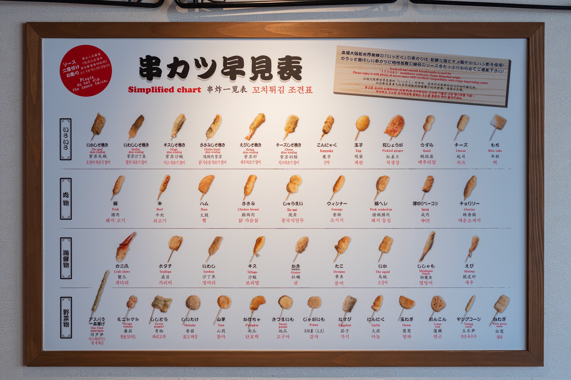 쿠시카츠 꼬치 튀김 안내 메뉴가 한글과 함께 큼지막하게 벽에 붙어 있었습니다.