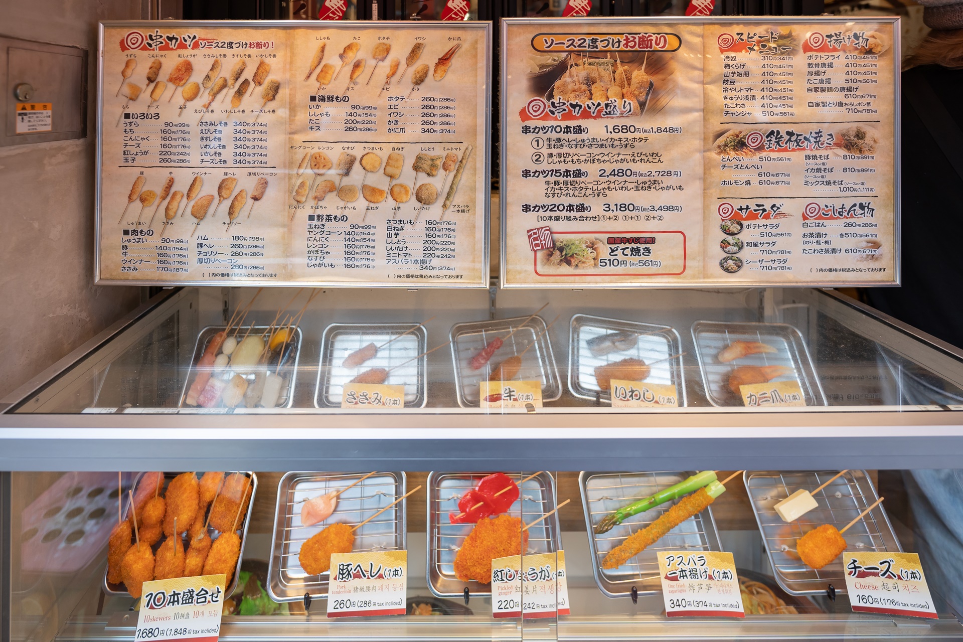가게 입구에는 다양한 종류의 쿠시카츠가 모형, 사진과 함께 설명되고 있으며 쿠시카츠 이외에도 야키소바, 돈페이 등 오사카의 명물 요리도 소개되고 있었습니다.