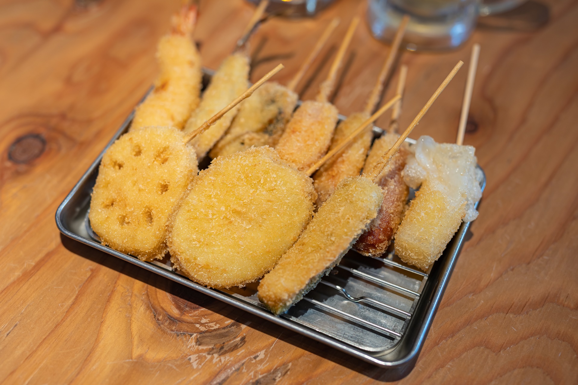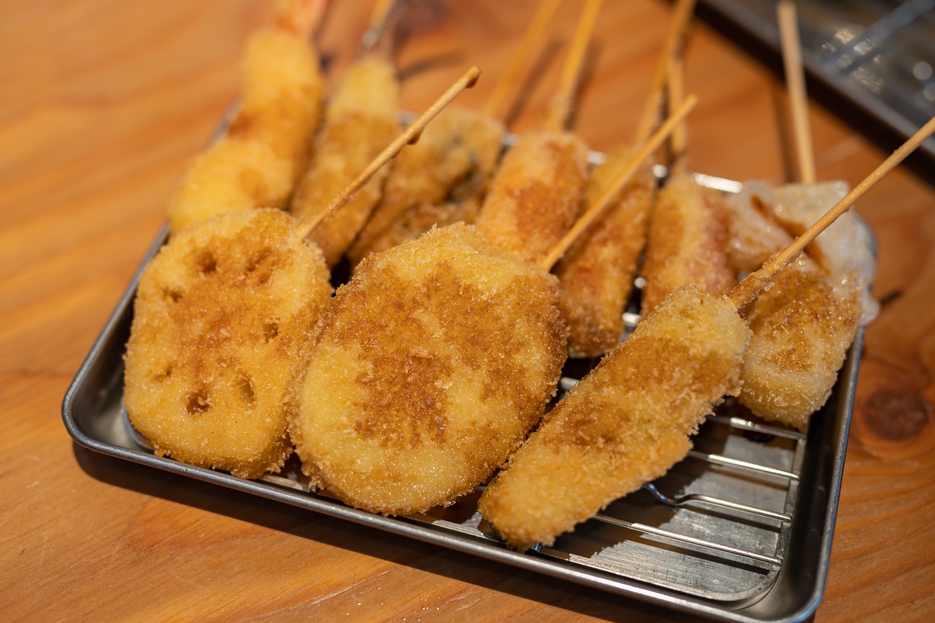 쿠시카츠(串カツ)는 꼬치에 여러 재료를 꽂아 튀겨내는 오사카의 명물 요리로 재료에 튀김옷을 입힌 뒤 입자가 고운 빵가루를 입혀 튀겨냅니다.