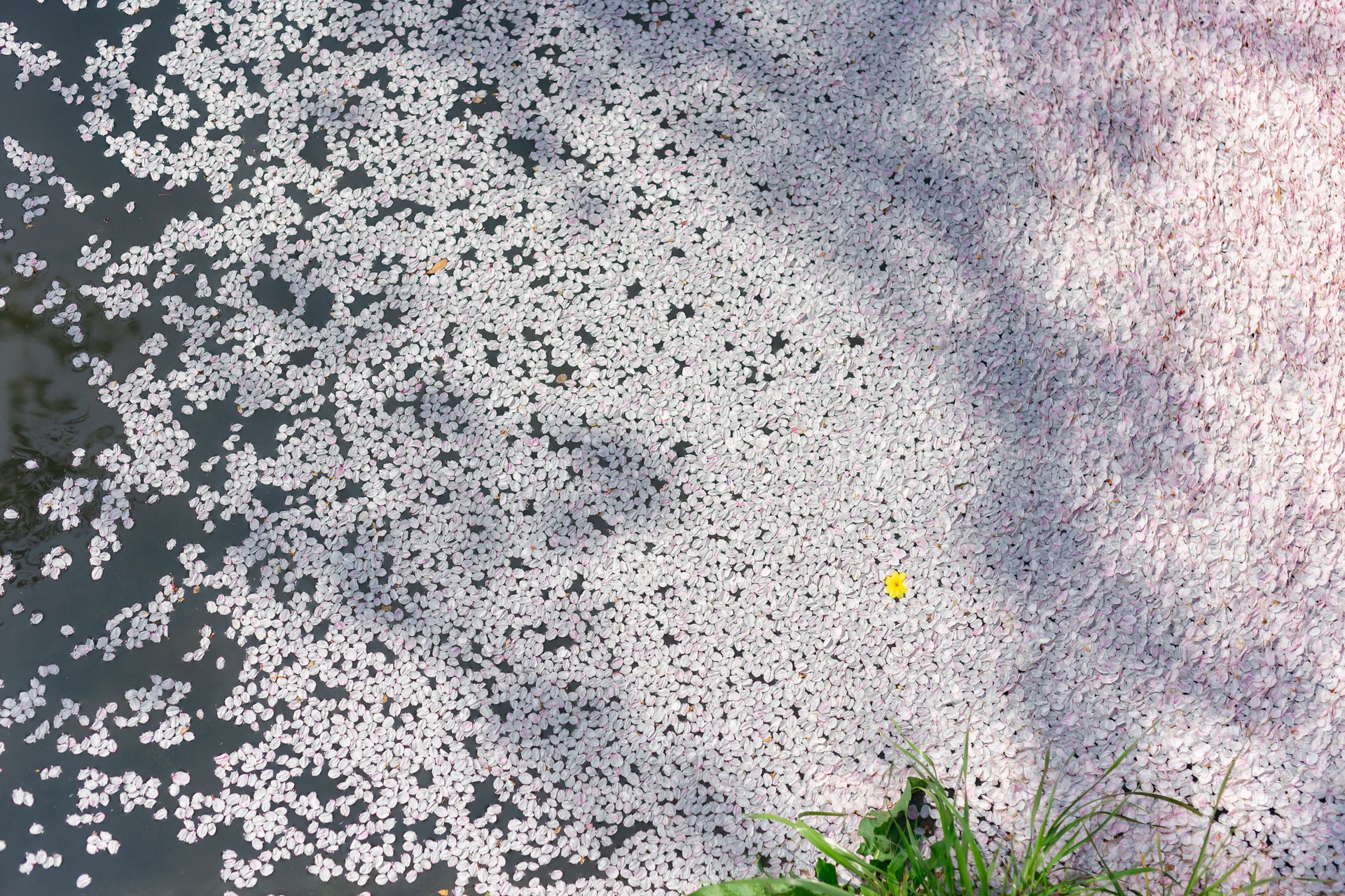 수로에 벚꽃이 밀려오며 멋진 봄의 그라데이션을 만듭니다.