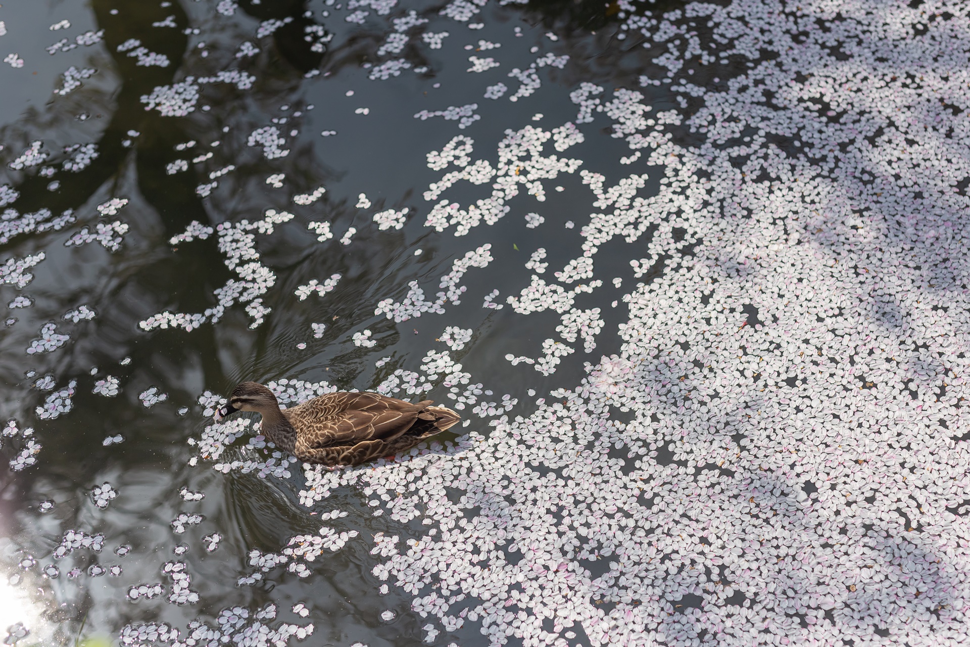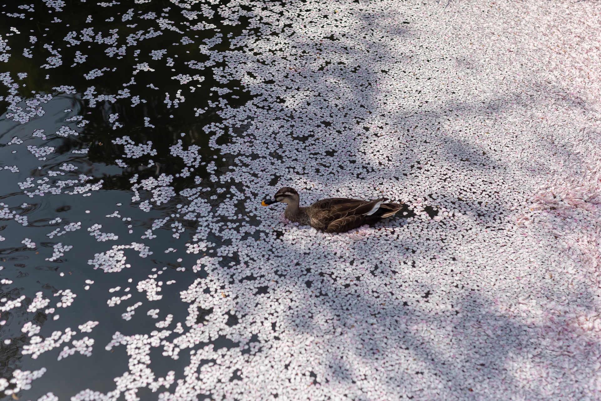 오리도 신이나서 벚꽃 수로에서 수영을 합니다.