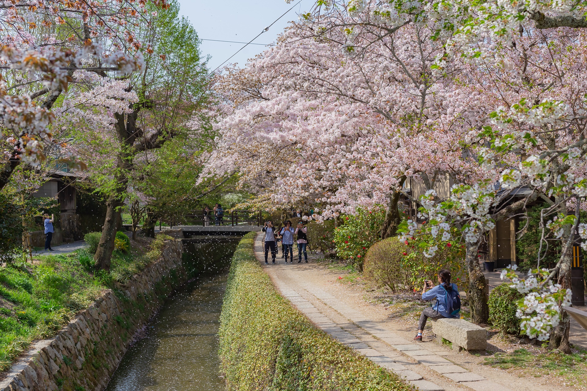 철학의 길은 비와호 수로를 따라 약 1.5km의 오솔길이 계속됩니다. 수로에는 벚꽃 잎이 가득하며 일본의 길 100선에 꼽히는 산책로로 선정되었습니다. 풍경이 아름다워 많은 사람들이 이 길을 찾게 되며 벚꽃 시즌 철학의 길을 걸으며 보이는 풍경은 마치 한 폭의 그림과 같습니다.