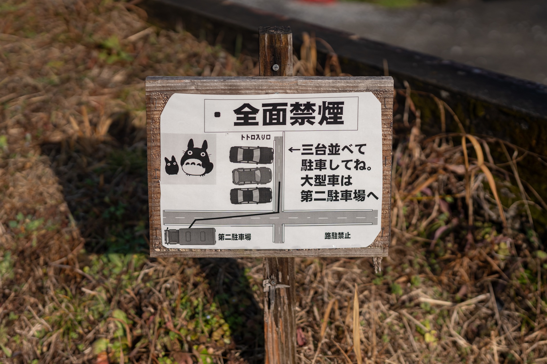 주변에는 논 밭 밖에 없는 조용한 시골마을 다카치호 미네 산이 이쁘게 보이는 들판 앞에 토토로가 그려져 있는 작은 간판의 주차장 표시가 보입니다. 사람이 제법 찾아오는지 제2 주차장이라는 표시도 보입니다.
