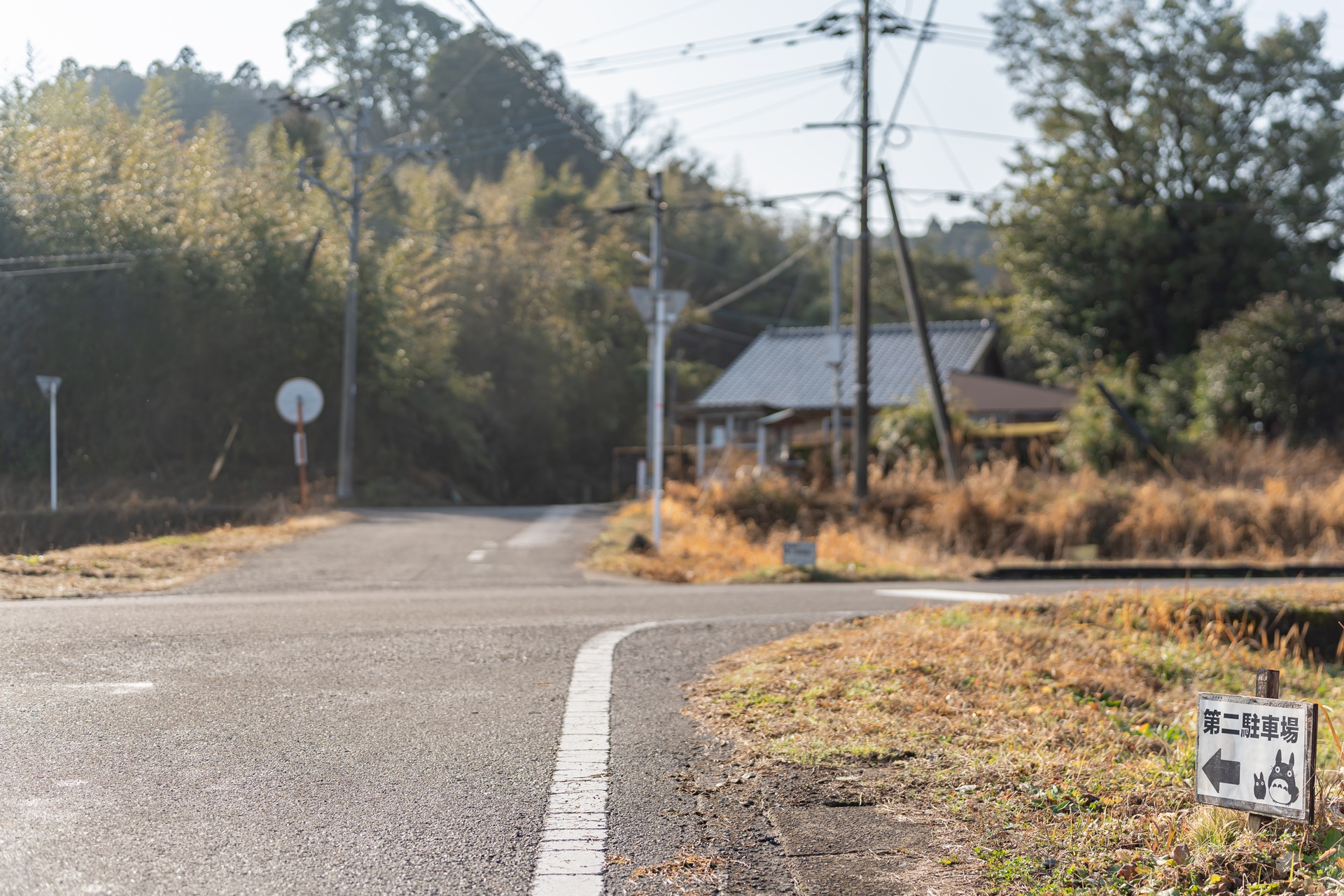 주변에는 논 밭 밖에 없는 조용한 시골마을 다카치호 미네 산이 이쁘게 보이는 들판 앞에 토토로가 그려져 있는 작은 간판의 주차장 표시가 보입니다. 사람이 제법 찾아오는지 제2 주차장이라는 표시도 보입니다.