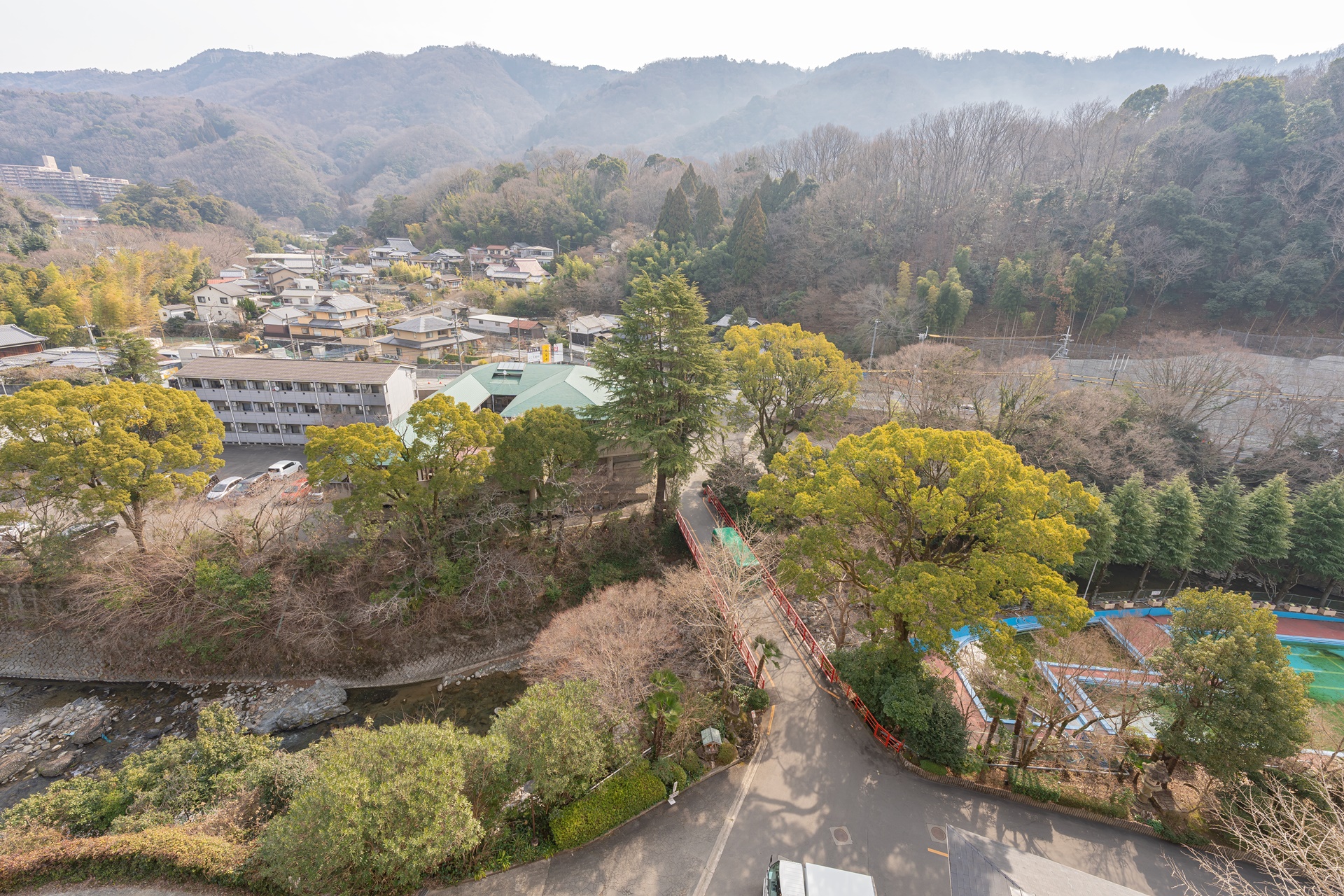 객실 창문을 열어보면 베란다와 함께 후시오카쿠 온천료칸 주변의 풍경이 한눈에 보입니다.
