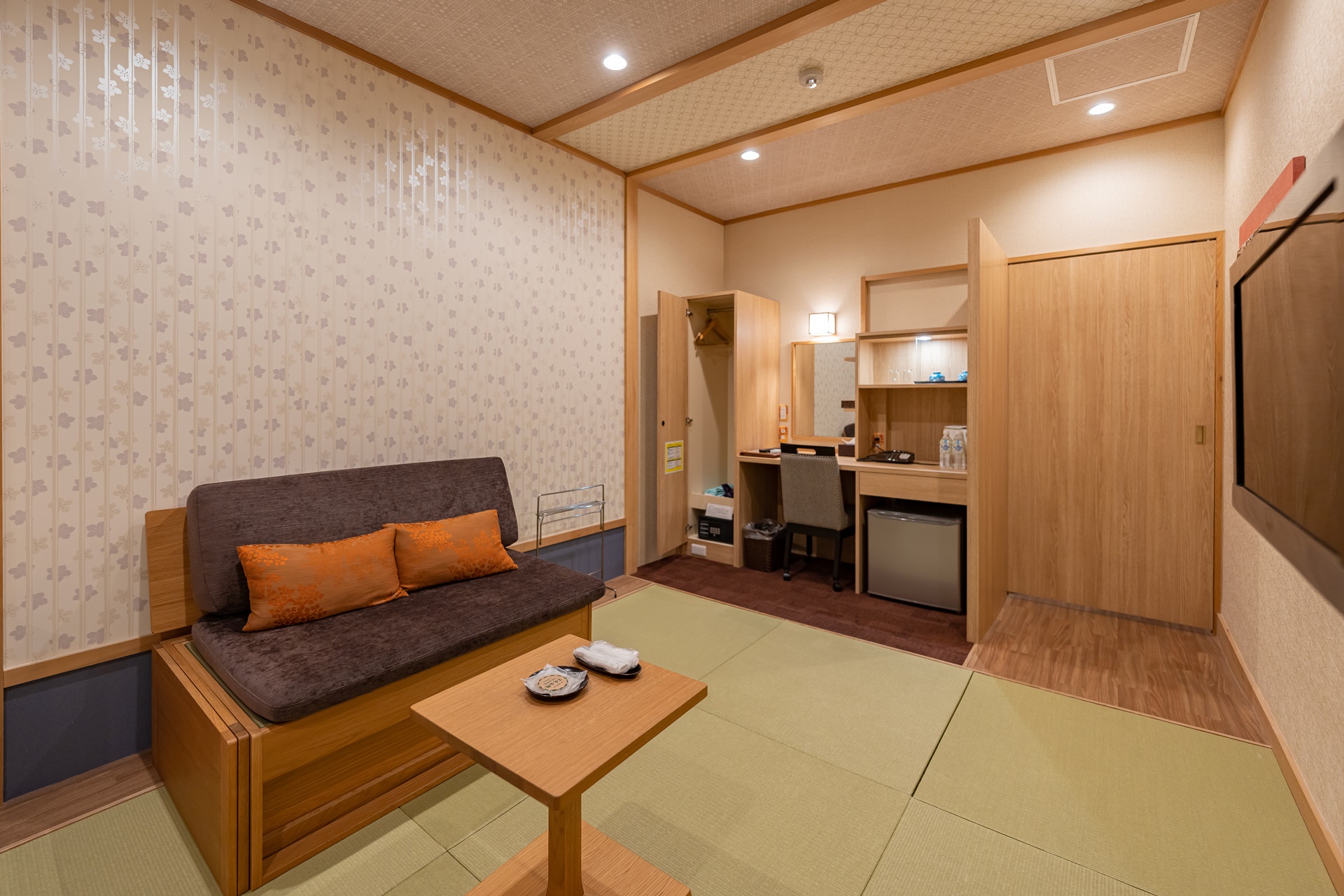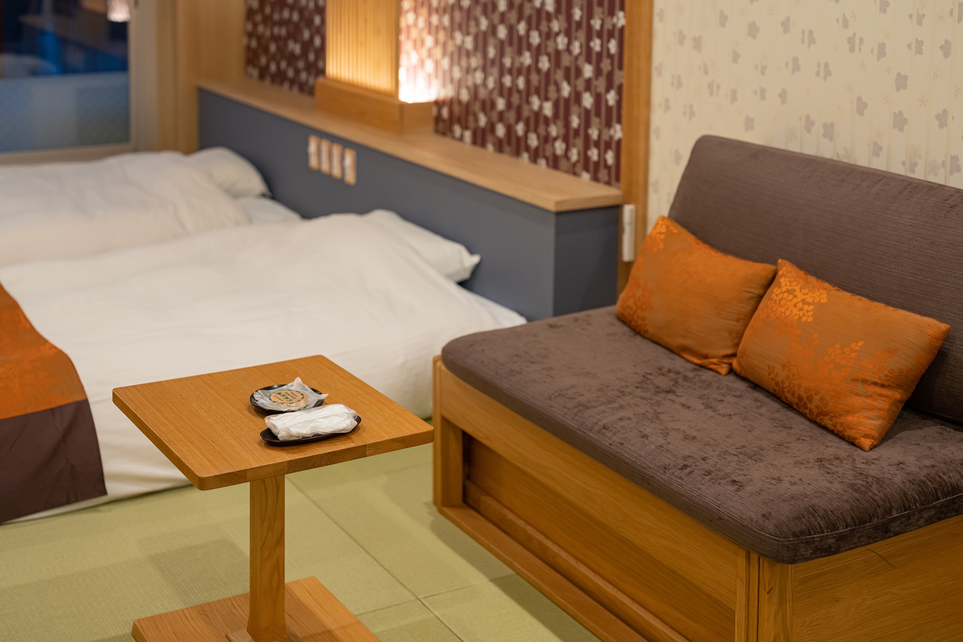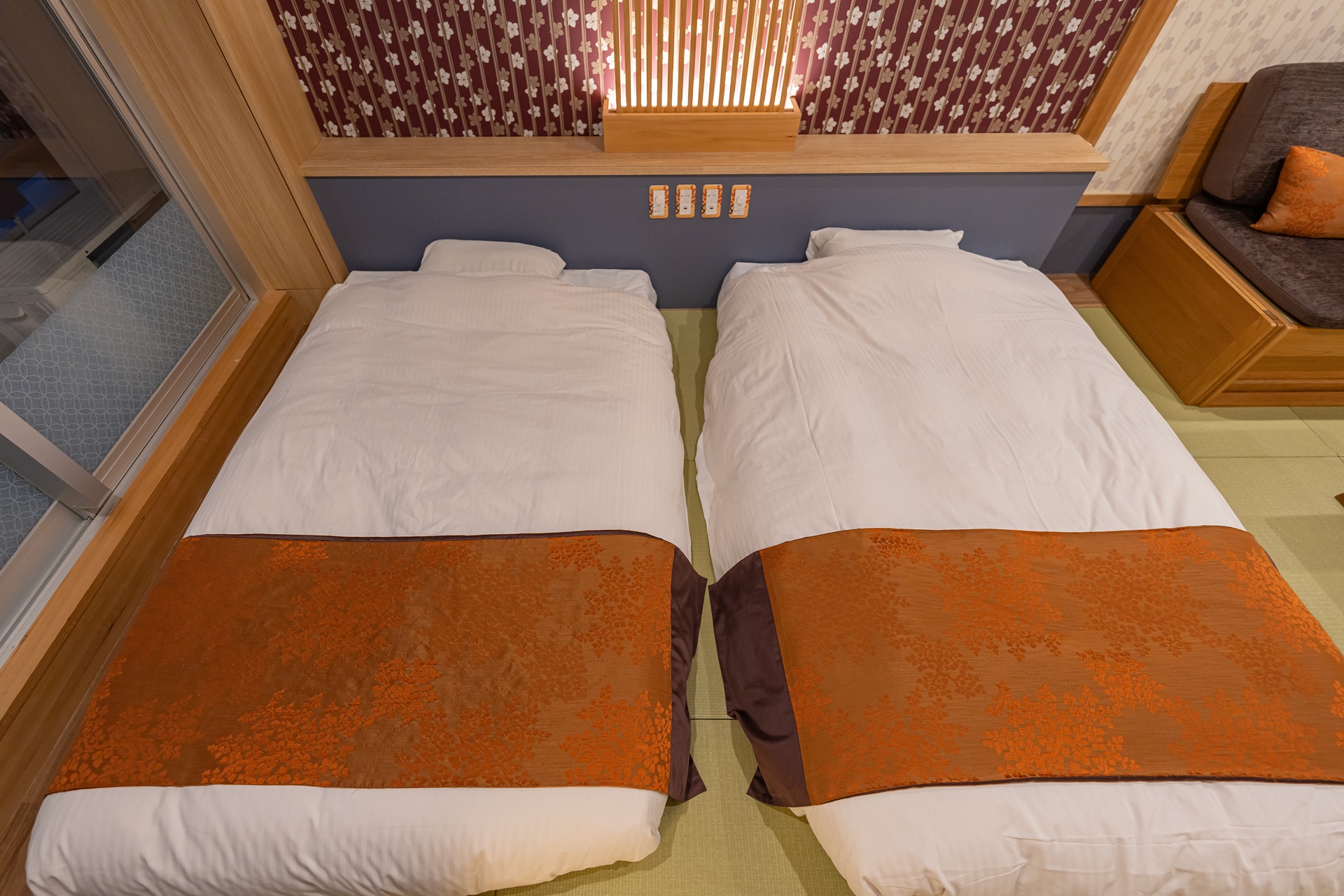 다다미 위에 트윈 침대가 놓여있으며 사이즈는 싱글보다 살짝 큰 느낌이었습니다.