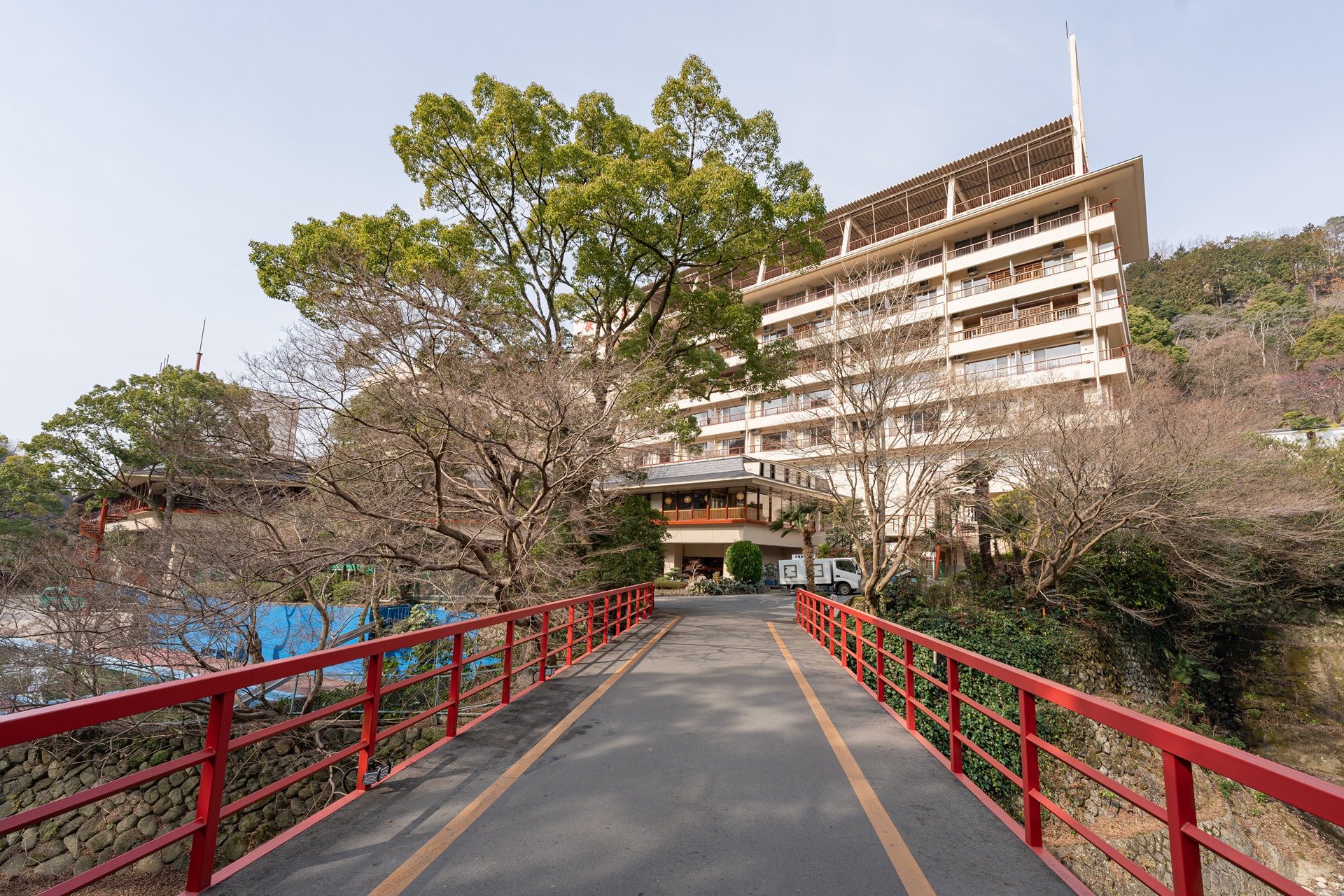 후시오카쿠 온천료칸에 도착하였습니다. 10분 정도 밖에 걸리지 않은 것 같은데 오사카 시내에서 자연속의 시골 풍경으로 갑자기 바뀌었습니다. 온천료칸 건물의 규모도 상당히 크고 주변 풍경도 이뻤습니다.