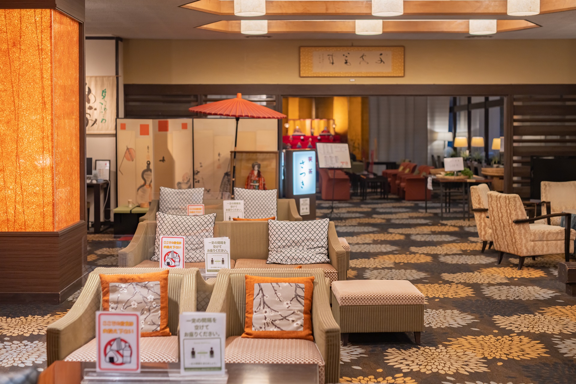 후시오카쿠 온천료칸 안에서는 유카타를 입고 돌아다닐 수 있는데 로비 옆 엘리베이터 공간에 다양한 디자인과 사이즈의 유카타가 있어 맘에 드는 것을 고를 수 있었습니다.