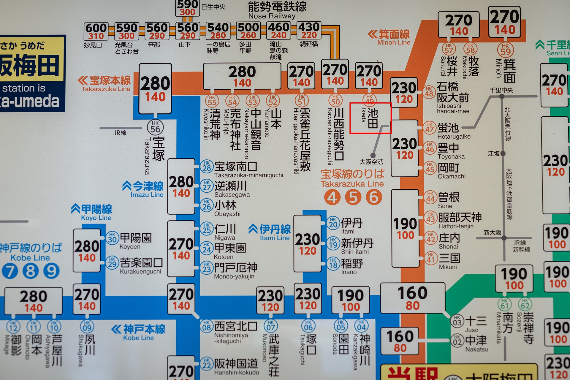 오사카 우메다역에서 이케다까지는 보통, 급행, 리미티드 익스프레스 3종류의 열차가 다니는데 리미티드 익스프레스는 편성이 거의 없어 10~15분 간격으로 오는 급행을 이용하는 것이 가장 좋습니다. 보통은 25분 급행은 18분, 리미티드 익스프레스는 12분정도 걸립니다.