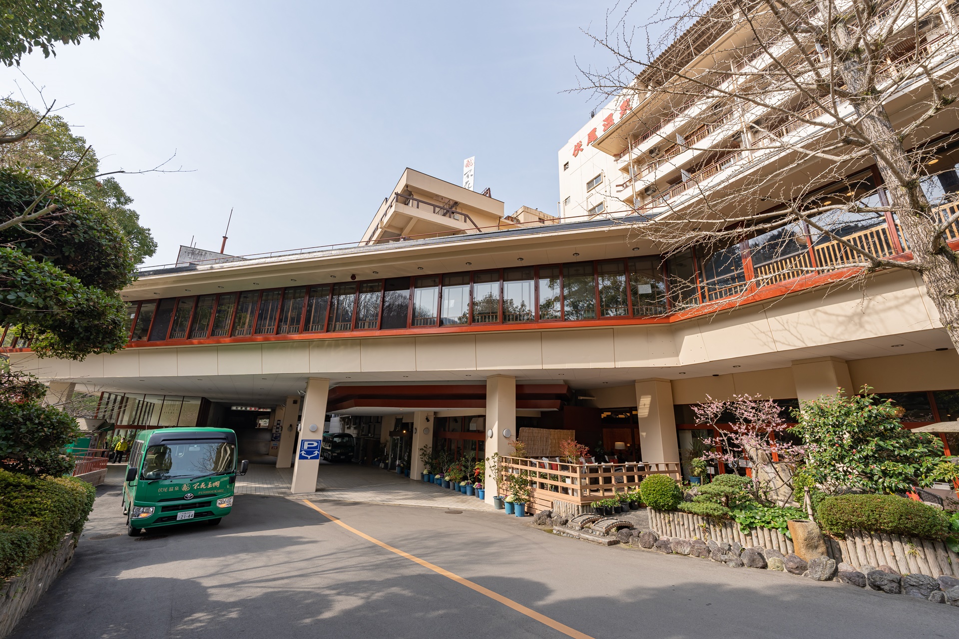잠시 후 녹색의 후시오카쿠 온천료칸 셔틀버스가 왔습니다.