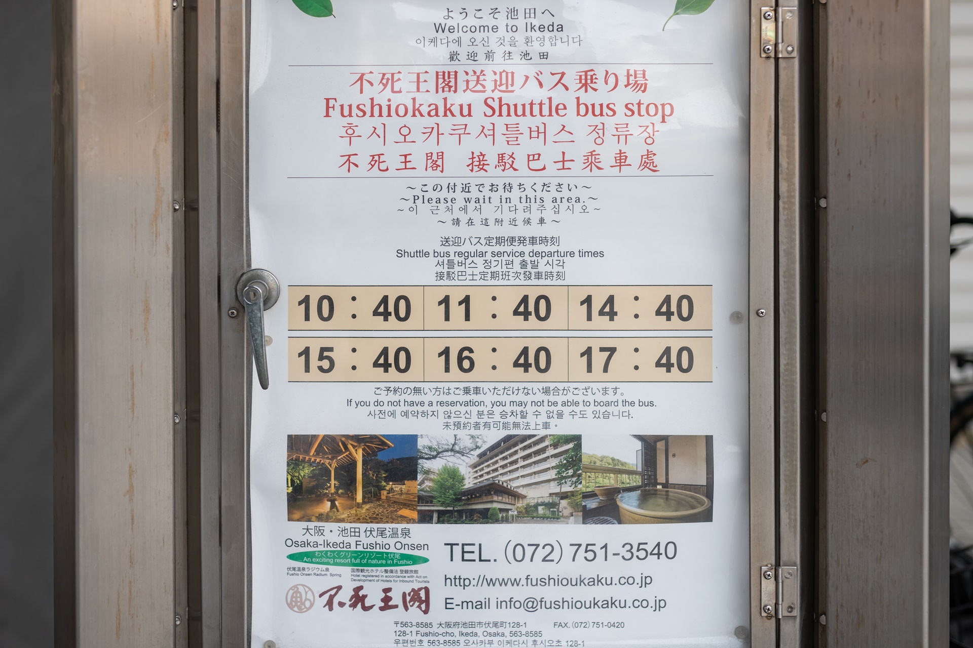 택시 승강장과 버스 정류장이 있는 이케다 역 북동쪽 출구 아래 쪽에 위치해 있으며 녹색 벤치 위에 후시오카쿠 온천료칸 셔틀버스 안내가 적혀 있습니다.