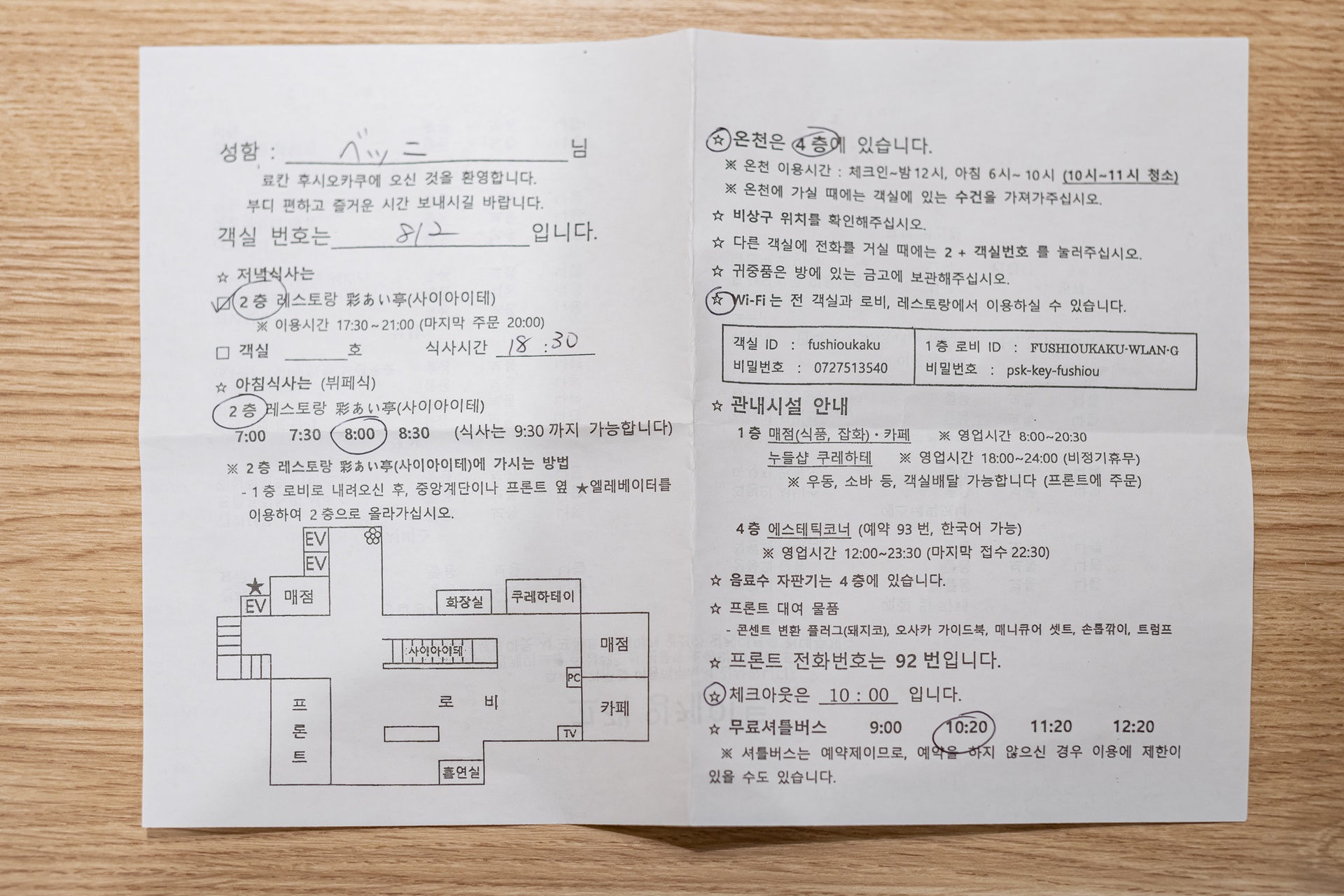 실내를 둘러보고 체크인을 합니다. 이곳 호텔 안내는 한글 안내가 적혀 있는 종이로 안내를 받았고 이때 저녁과 아침, 무료 셔틀 버스의 시간을 예약합니다.