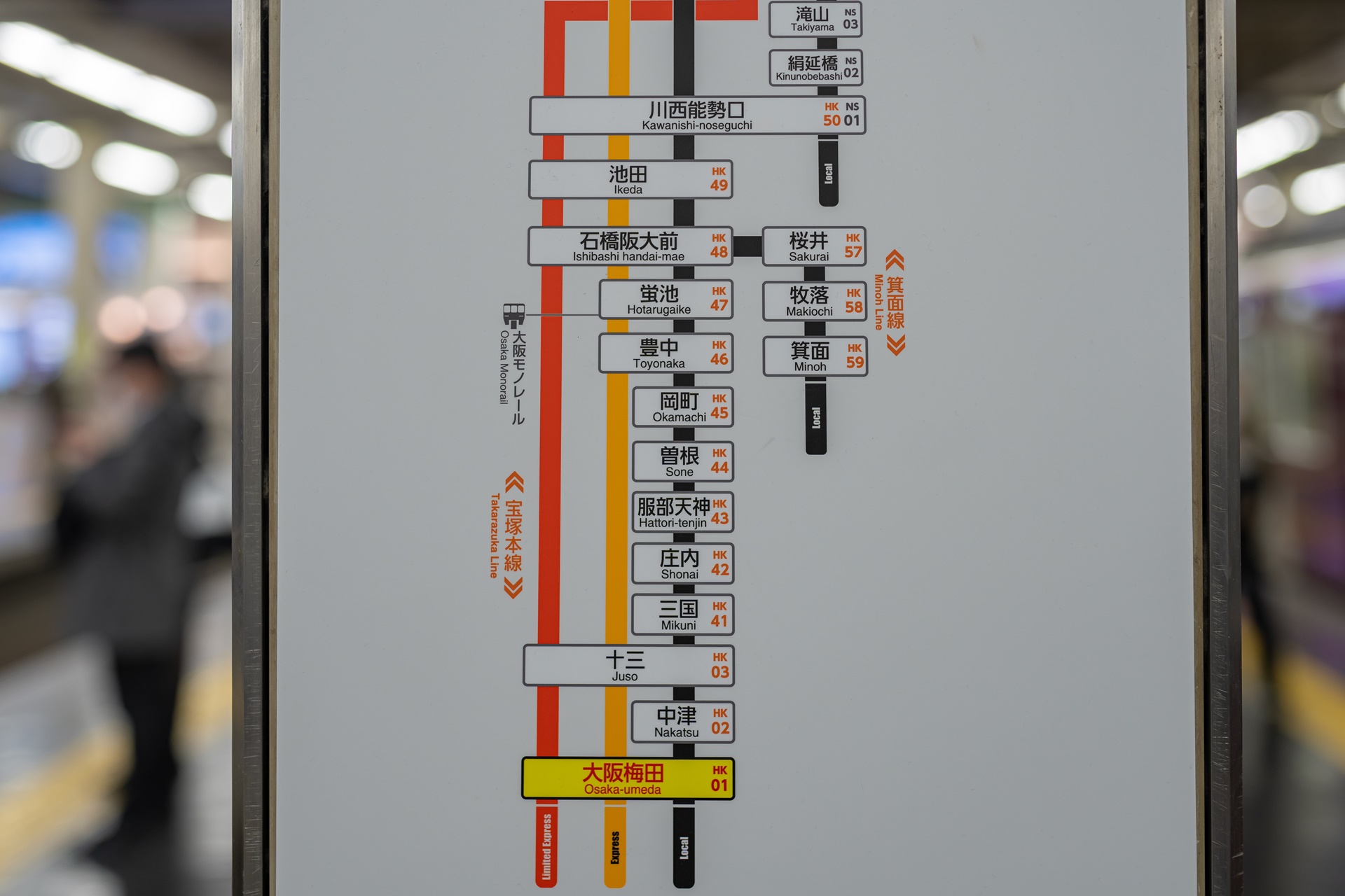 오사카 우메다역에서 이케다까지는 보통, 급행, 리미티드 익스프레스 3종류의 열차가 다니는데 리미티드 익스프레스는 편성이 거의 없어 10~15분 간격으로 오는 급행을 이용하는 것이 가장 좋습니다. 보통은 25분 급행은 18분, 리미티드 익스프레스는 12분정도 걸립니다.