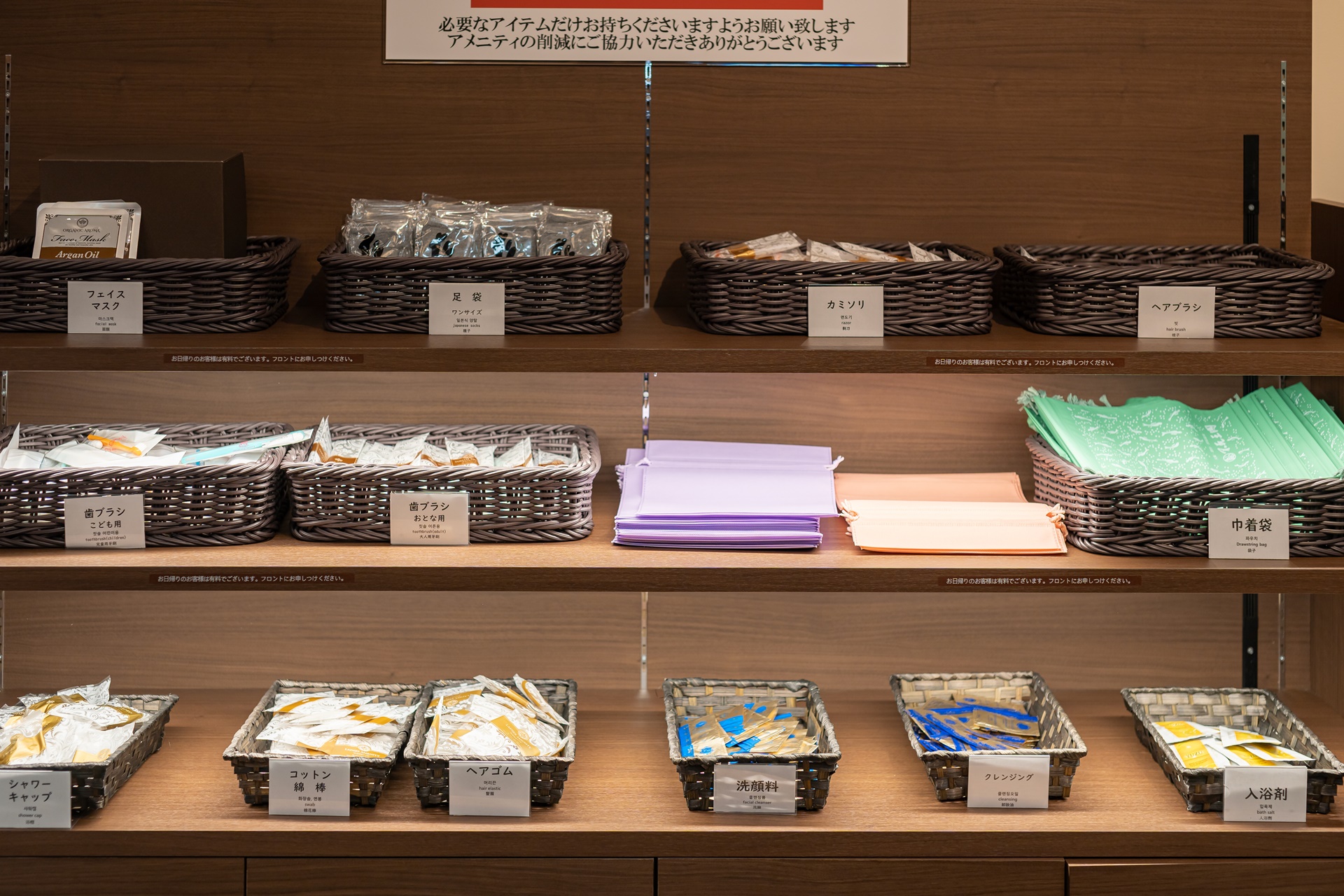 호텔의 어메니티는 로비 한편에 마련되어 있었고 치약, 칫솔, 면도기, 빗, 로션 등 다양한 종류가 진열되어 있었습니다.
