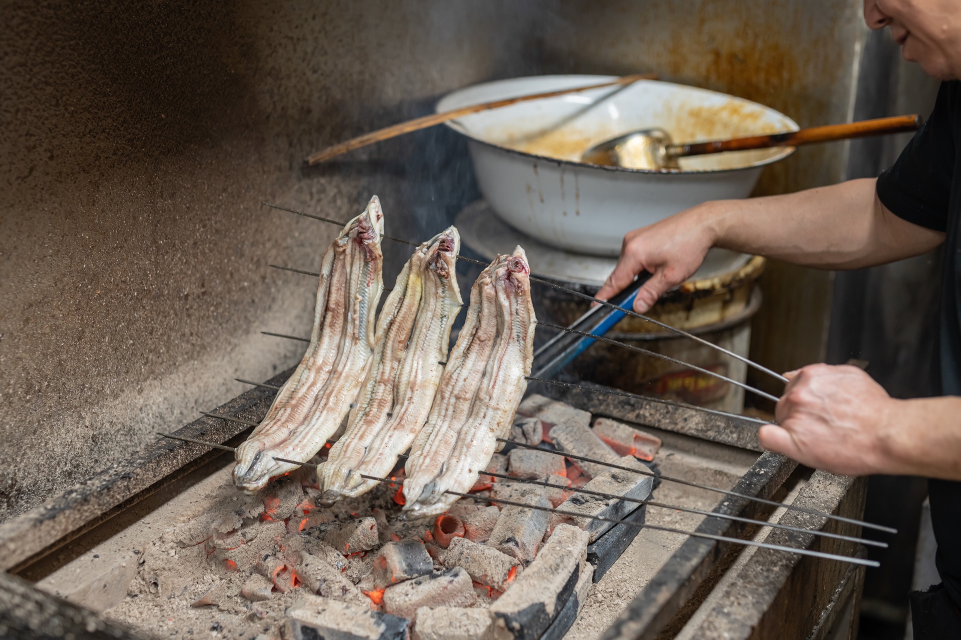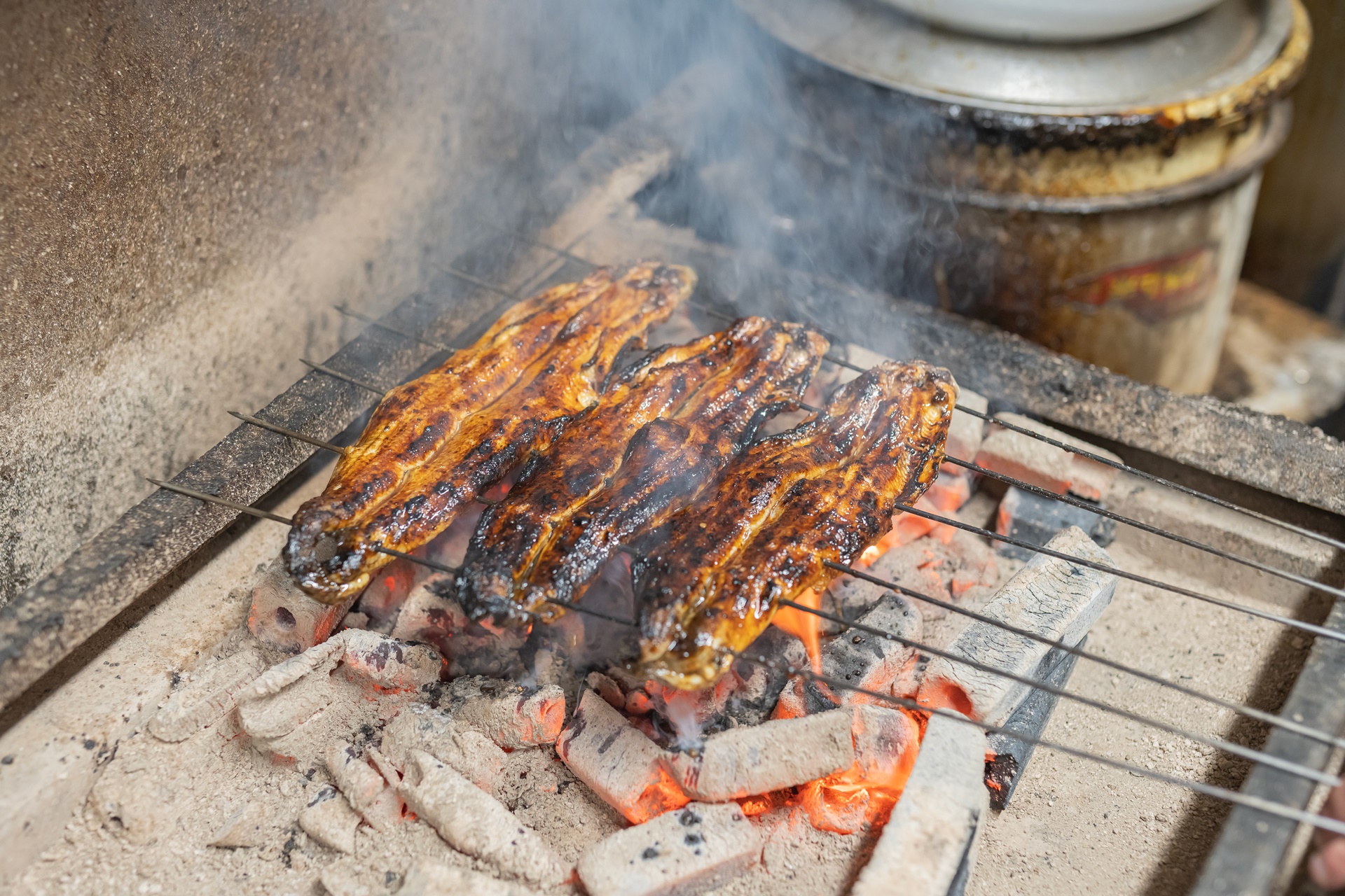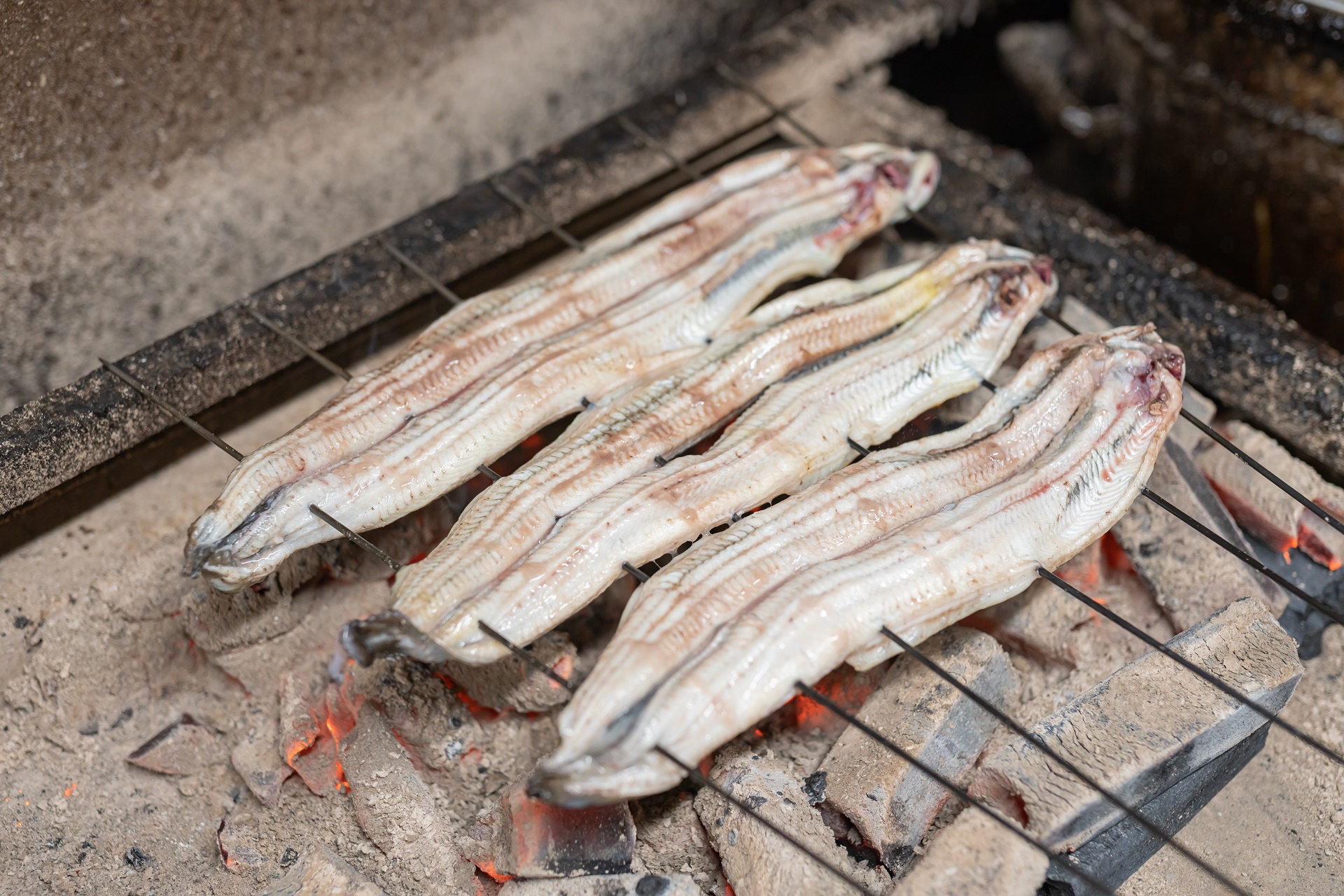 빠르게 꼬치에 꽂은 장어는 잘 달궈진 숯불에 올려 천천히 구워냅니다.